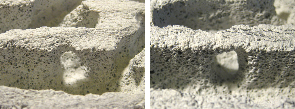 La presenza di due facciate rende già il nido particolarmente soggetto a sbalzi interni di temperatura e umidità. Questo è inevitabile, purtroppo. L’umidificazione dovrà essere accuratamente dosata anche perché sorgerà un secondo problema: la copertura totale della superficie e la sua conseguente colorazione su tutte le facciate renderà difficile riscontrare il cambio di consistenza del gasbeton bagnato/asciutto. Inoltre, essendo il modello finale incassato in una “vasca” di materiale non traspirante, la traspirazione del gasbeton sarà notevolmente rallentata.