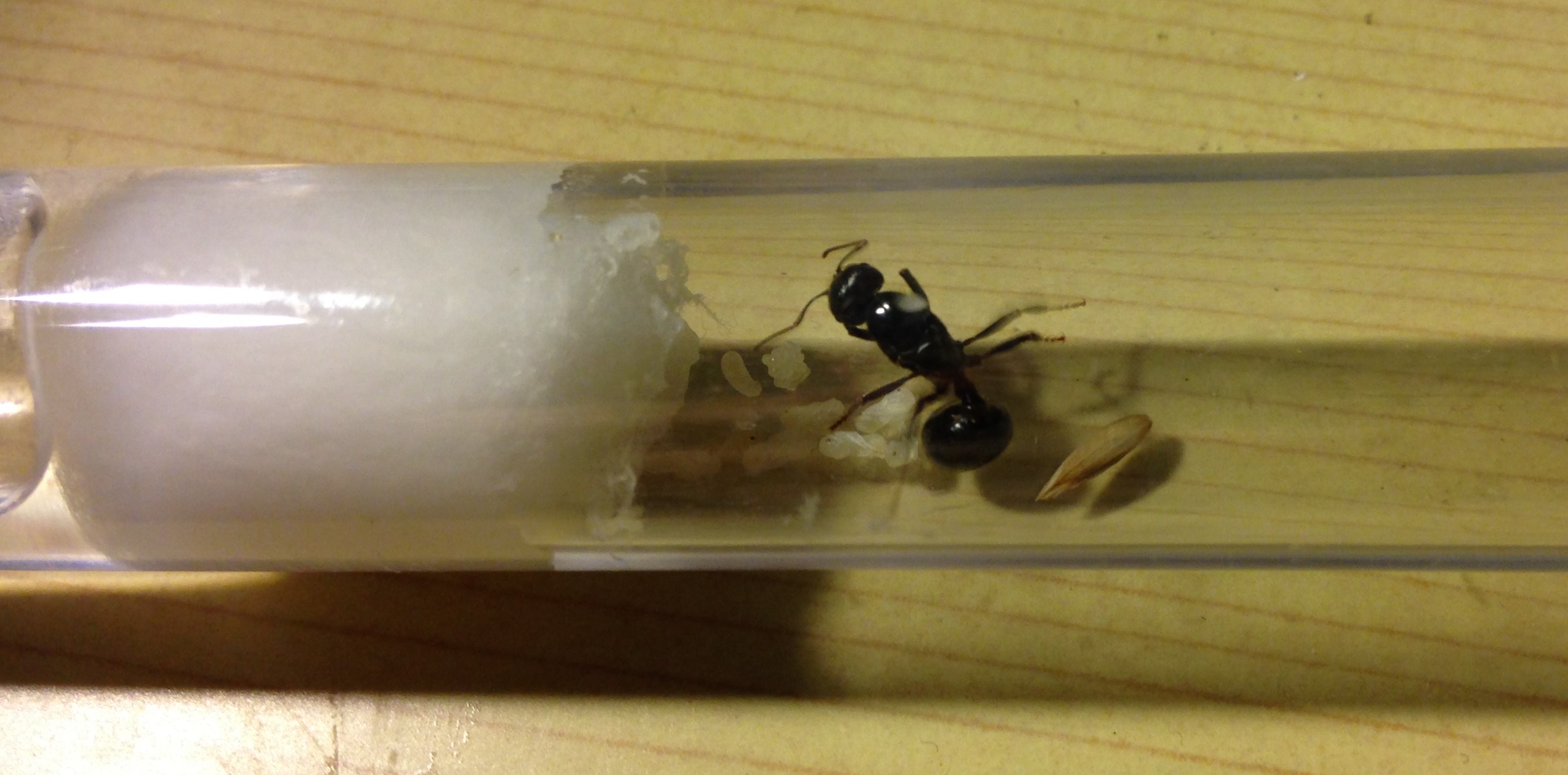 Tutto procede per il meglio, ormai le operaie sono tornate ad essere circa una quarantina, un mucchio di nuove pupe si è accumulata e molte altre larve e uova si intravedono in un bel mucchio! Ho spostato la provetta in un nuovo formicaio costruito su misura per loro, spero che in futuro sarà di loro gradimento! Ne approfittò per chiedere informazioni su dove si possono trovare piccoli acquari in vetro a buon prezzo, perché ho costruito una roba rozza io, ma la base l'ho fatta in legno e si è imbarcato tutto...