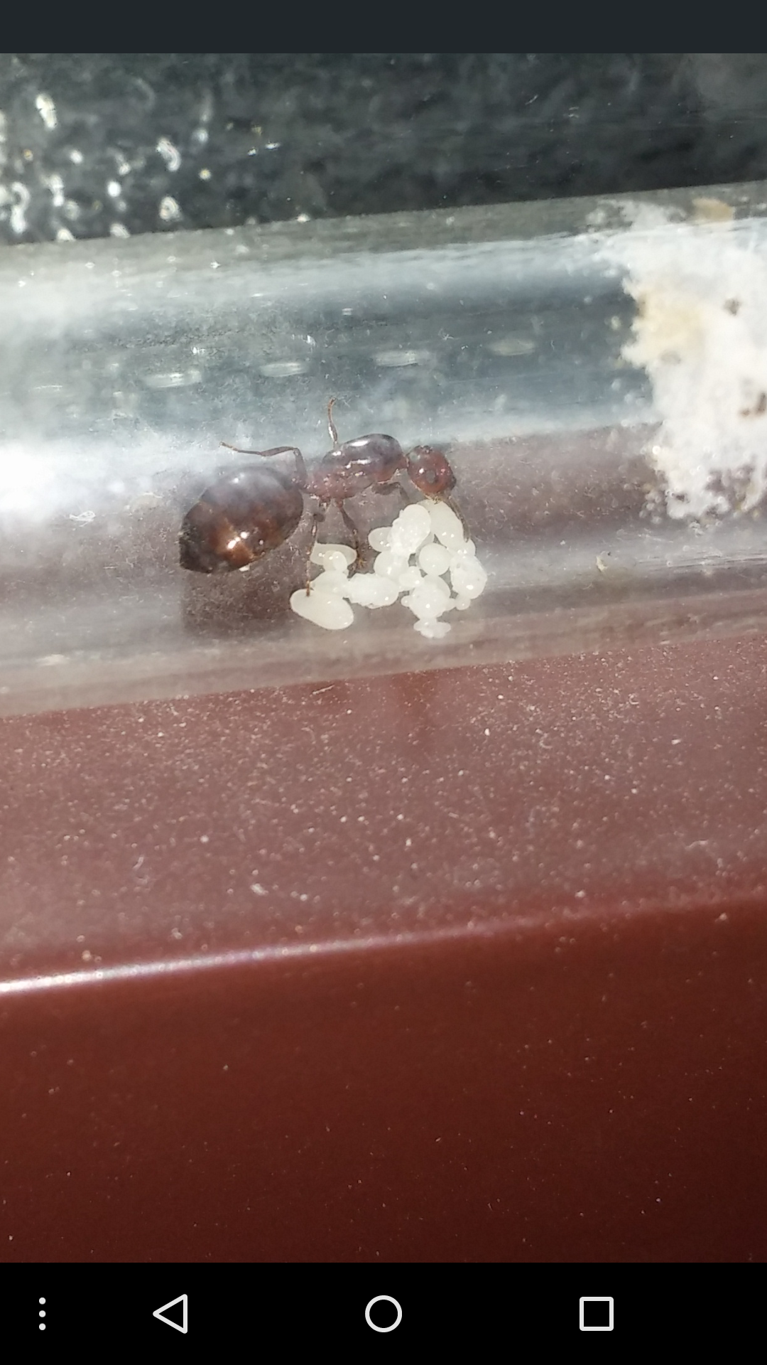 Buon giorno! Oggi dopo un mese dalla prima deposizione di questa reginetta, mi sono apprestato a fare foto decenti! È stata trovata in un muretto di casa mia in una notte di fine estate 2014, assieme ad un altra molto simile a lei! Molto simile perché differiscono un po' nei colori! Infatti questa risulta essere completamente tendente al rosso, mentre la seconda solo per metà! Io possiedo già una colonietta di una regina messa in fondazione l'anno scorso risalente a fine estate 2013 (probabilmente faccio il diario appena ho raccolto tutte le foto dell'ultimo anno:) )...inizialmente credevo derivassero tutte dallo stesso formicaio che ho sul tetto e quindi credevo ciecamente fossero Crematogaster scutellaris...le uniche differenze visive erano il fatto che queste 2 fossero leggermente più piccole (ma era una cosa che non mi aveva creato sospetti perché le differenze erano solo a livello del gastro meno dilatato sulle ultime 2 ) e che avevano colori leggermente diversi ma data la loro presunta origine non mi sono preoccupato di controllare! Adesso osservando le formiche sotto la luce del sole le differenze sono davvero evidenti! La regina risalente al 2013 ha un capo più rosso ed è nera per il restante, mentre queste 2 di fine 2014 hanno il capo rosso marroncino chiaro .-. E questa della foto mantiene lo stesso colore anche per il gastro! Non so come spiegarlo! La colorazione balza subito all occhio! Mentre con una normale luce in casa non si vedeva bene, con la luce del sole è tutta un altra cosa! Ora metto la foto! Potrebbe essere una Crematogaster schmidti dato che sulla scheda delle Crematogaster scutellaris ho letto che al nord est è presente?