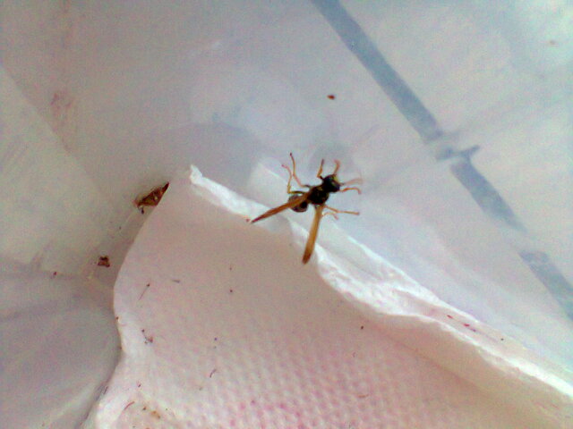 Oggi ho trovato un piccolo nido di Polistes: conta 6 cellette ed ha già 1 larva che si sta impupando! La regina è molto calma e si fa maneggiare volentieri (da quando le ho somministrato una goccina di miele sopra uno stuzzicadenti
