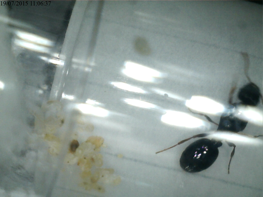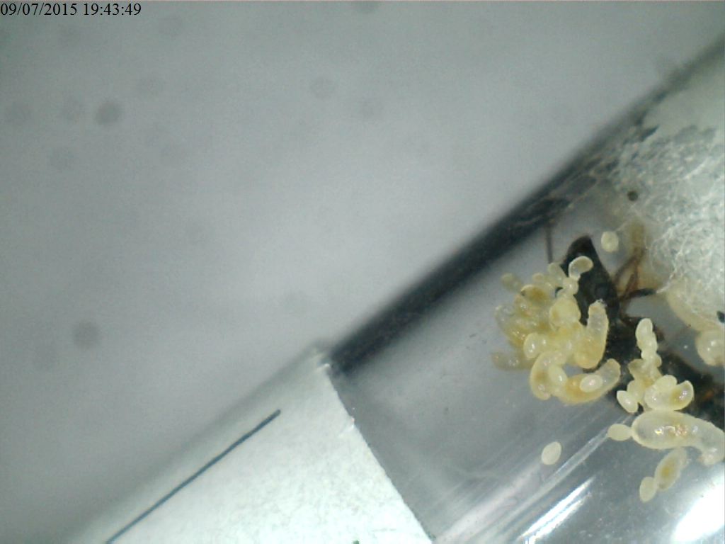 Oggi sono andato a vedere come stavano entrambe le regine, e mi sono ritrovato una sorpresa: le formiche sono piene di larve e uova!!!! :wow: :wow: :wow: Ecco qui qualche foto: