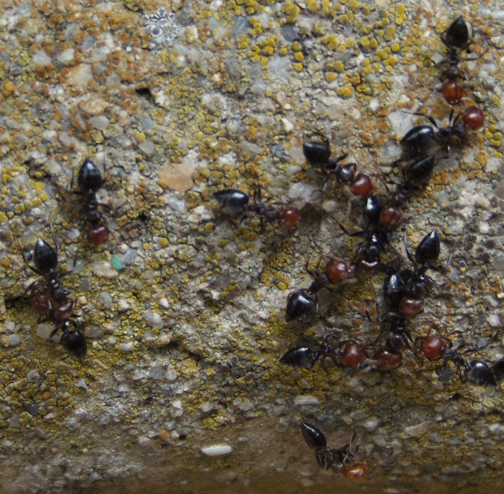 dopo una nottata di pioggia ritrovo davanti casa quello che è letteralmente un tappeto di presunte Crematogaster scutellaris. E' ovvio che nei paraggi sono nascosti numerosi formicai, ma questa "uscita di massa" la trovo alquanto insolita e curiosa. Queste formiche stanno ferme ormai da ore, alcune si ammasano (non sembra ne combattimento ne grooming) e al minimo disturbo rispondono con qualche attimo di frenesia, per poi tornare alla calma.