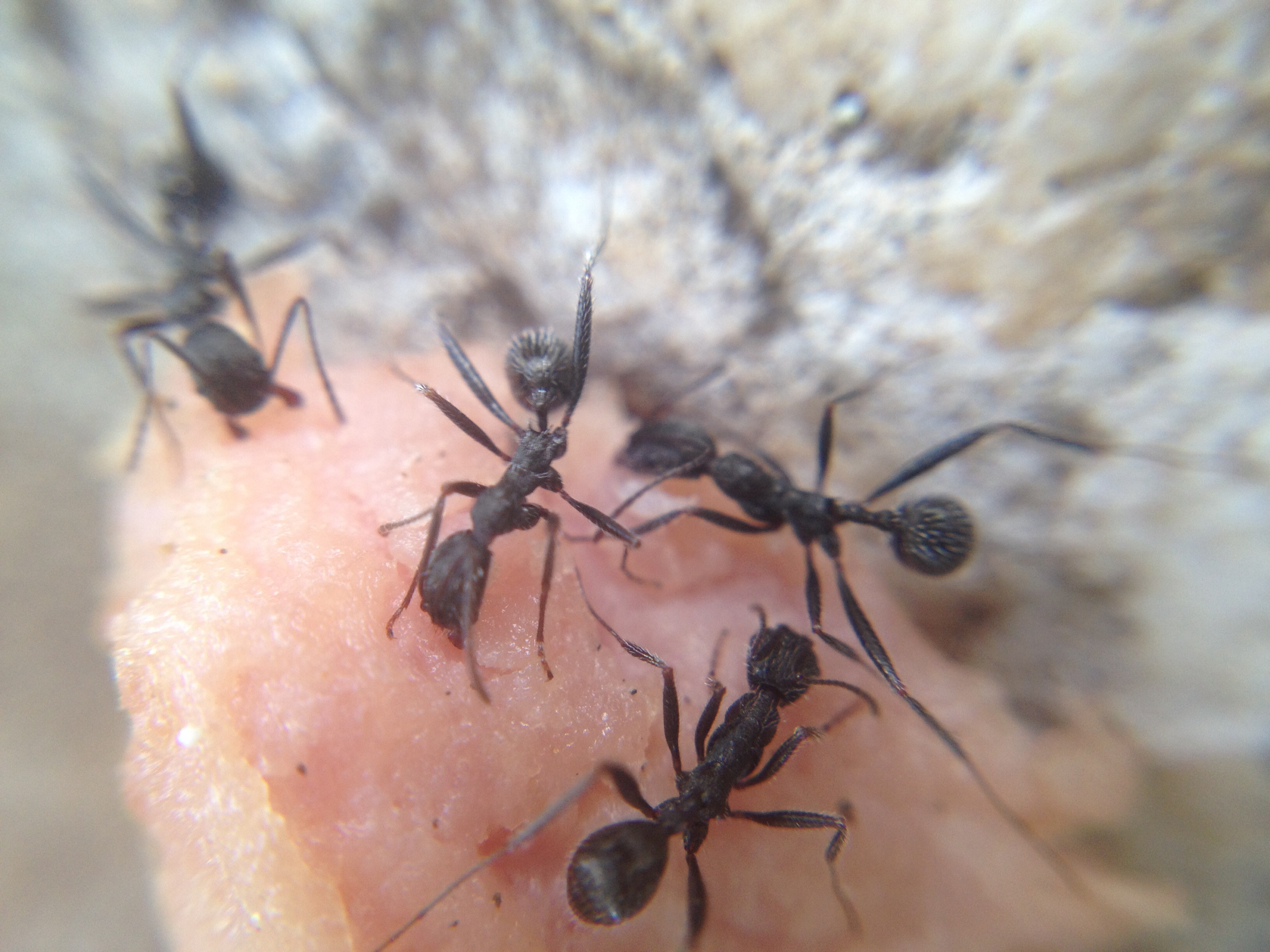 Salve, le briciole di un panino al prosciutto hanno subito attirato formiche di due specie, che si sono equamente divise ciò che cadeva. Le Crematogaster scutellaris hanno raccolto le briciole di pane, mentre quest'altra specie (che non conosco e di cui chiederei una mano nell'identificazione) si è fiondata sul prosciutto. Sono nere, lunghezza 5-7 mm e hanno dei peli sull'addome. Sono velocissime. Cosa potrebbe essere secondo voi?