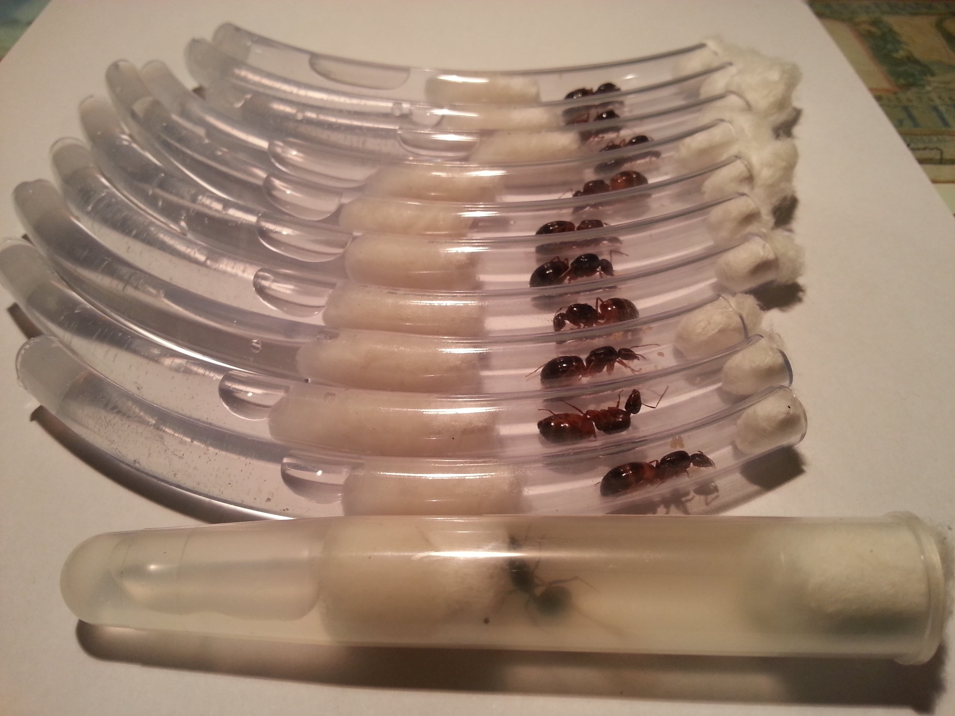 piu di due settimane fa ho trovato una decina di regine di Camponotus nylanderi, subito catturate, sono combinato in questo modo, ho dovuto inserirle in provette d'emergenza senza serbatoio, ho bagnato bene il cotone che faceva da tappo, hanno tutte deposto uova e sembrano stare bene..