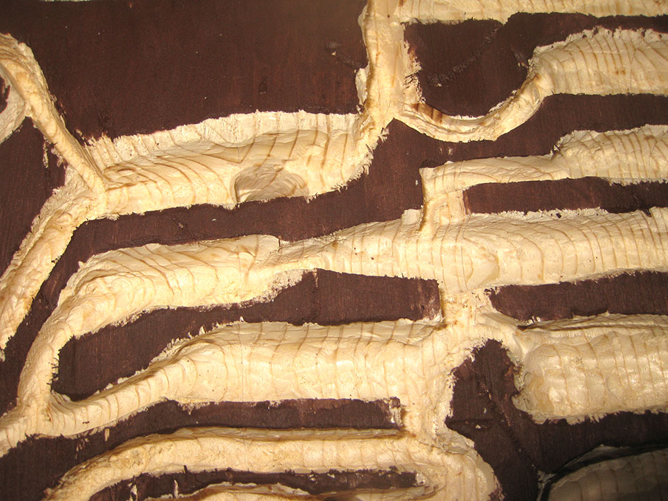 Mi sono anche imbarcato in un piano folle: forse se avessi saputo l'impegno, avrei rinunciato... ho preparato una delle due facce in legno scavato con il Dremel, in modo da far assomigliare il più possibile le gallerie a quelle che le formiche scavano in natura.