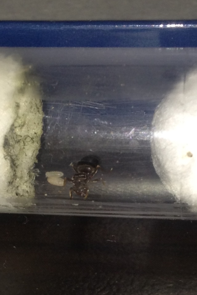 Ciao ragazzi, ho questa regina di lasius SP dall'estate 2015. Quest'inverno è morta tutta la colonia di una 30ina di operaie che le avevo messe in unarena(credo xke gli avevo dato da mangiare delle cose tossiche forse).. L'ho rimessa in provetta la regina e per 2 settimane non ha fatto nulla. Poi ha ricominciato a deporre e mi sembrava ne avesse fatte molte. Non capisco se le altre se le è mangiate e ne ha lasciate solo 2 crescere o meno! Potete darmi qualche consiglio grazie. L'acqua nel serbatoio è finita da 2/3 settimane ormai. Gli metto un po d'acqua nel cotone ma tutte le volte si stressa. Conviene aspettare che si schiudano le uova prima di collegare l'altra provetta e oscurarla? Grazie x i consigli.. Non capisco xke non depone più! La muffa che c'è sul cotone deriva che avevo messo un insetto che avevo ucciso e i resti li avevo lasciati x un po(li ho tolto ora)