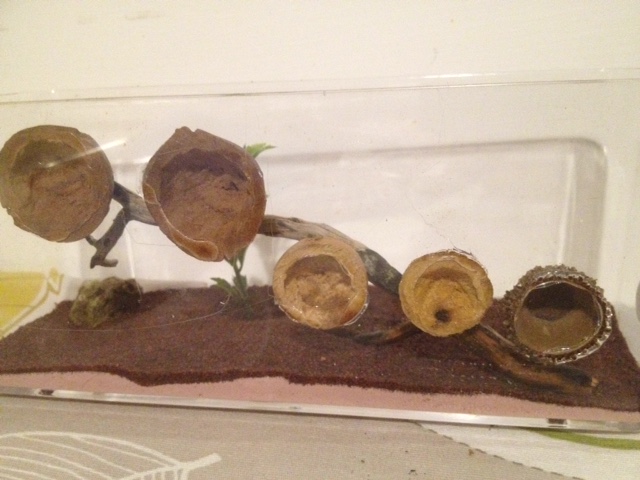 ringraziando ancora Entok per la bella colonietta di Temnothorax sp. datami a Entomodena, ieri mi sono dato alla costruzione di un piccolo formicaio per loro. Avendo due vecchissime galle a disposizione (recuperate dalle fascine di una catasta di legno a terra diversi anni fa), ho seguito i modelli mostrati qui sul forum, incollando le mezze galle alle pareti di un contenitore ikea. Ho deciso di metterle a diverse altezze per vedere quale sarebbe stata occupata prima. Dopo solo due ore dall'apertura della provetta in arena, le formiche si sono tutte trasferite nella galla più in alto. Incredibile la velocità!