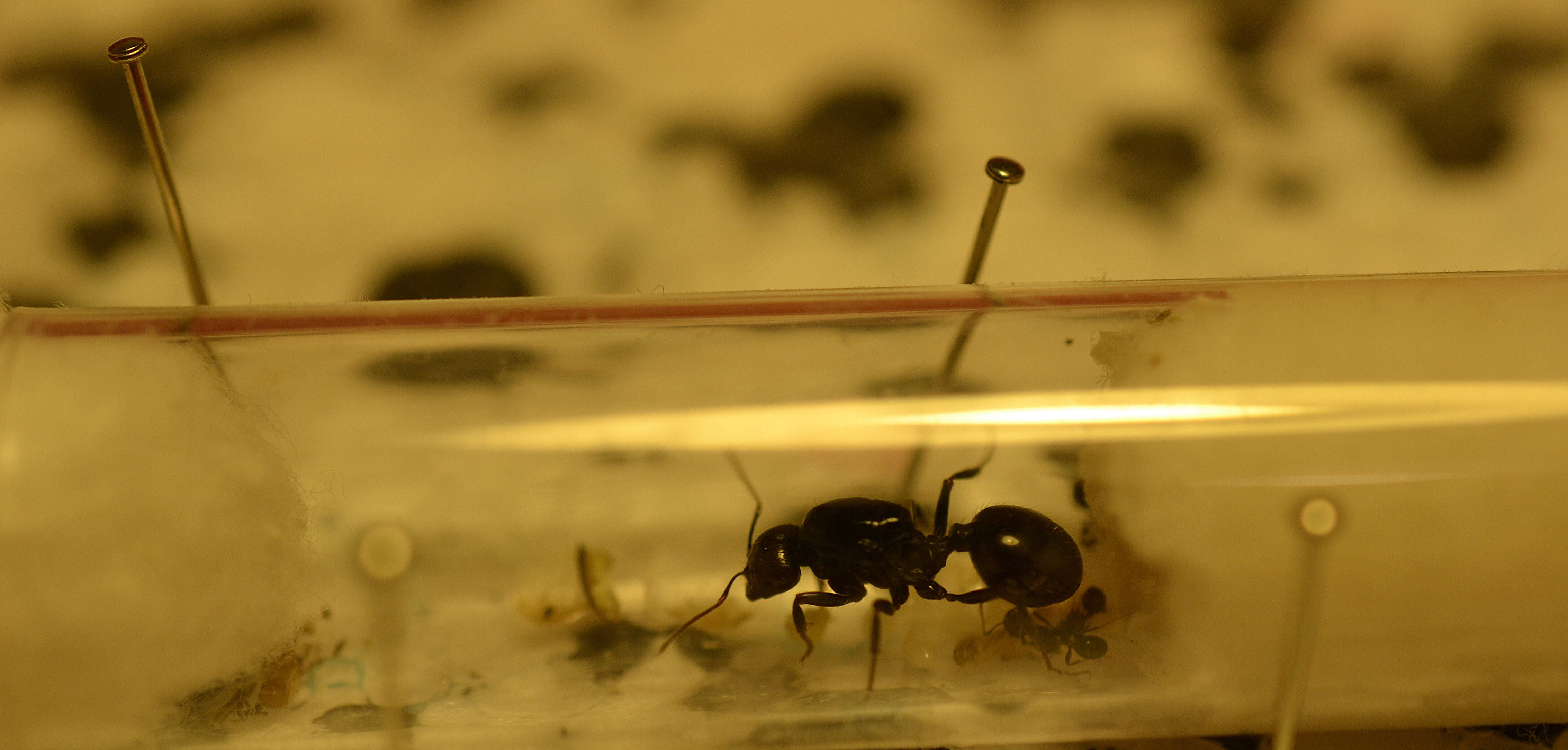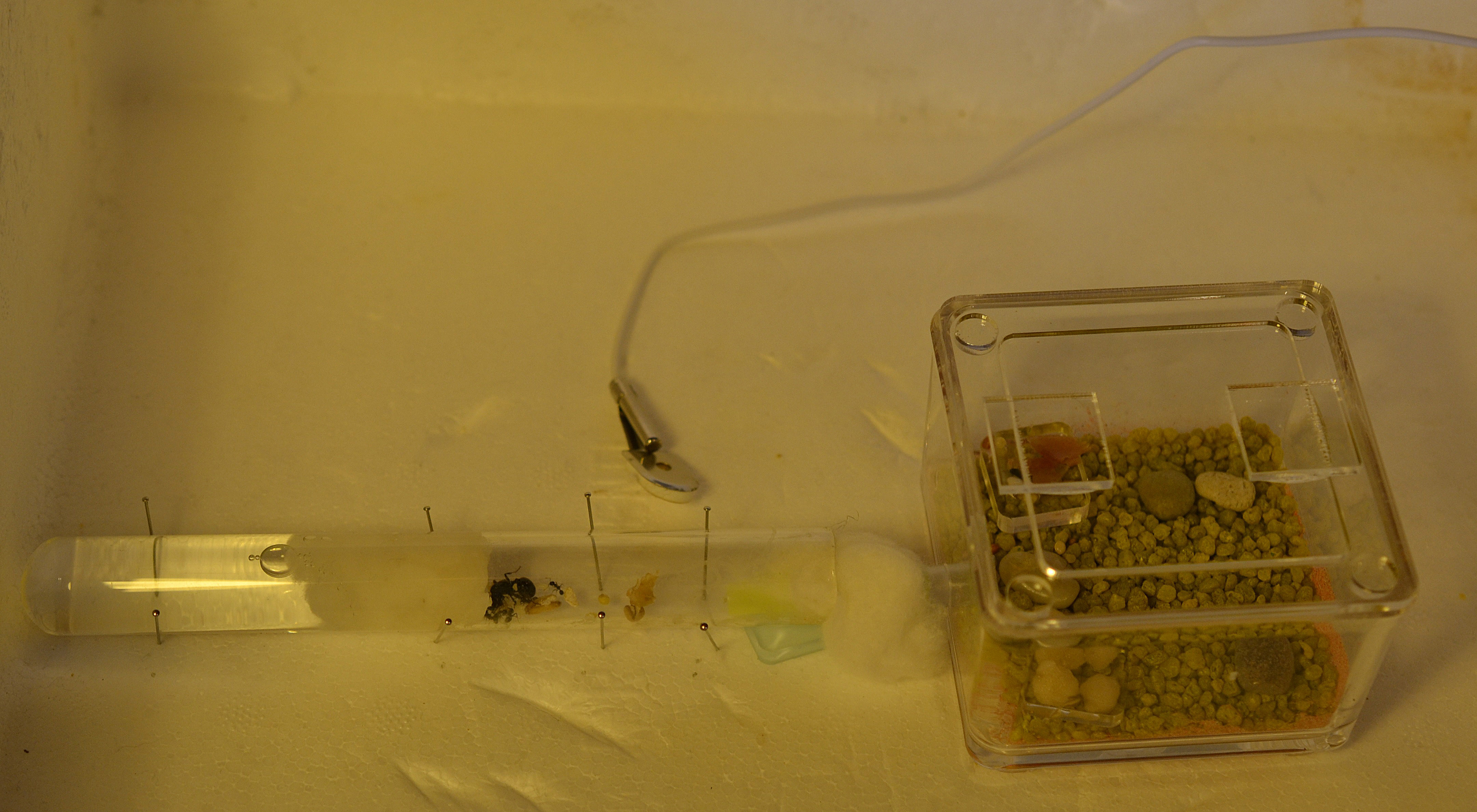 Le formiche, però, si trasferiscono solo in parte nella nuova dimora; due operaie, infatti, rimangono sempre in quella vecchia spostandosi a volte verso il resto della colonia ma senza mai lasciare vuota la provetta da rimuovere.