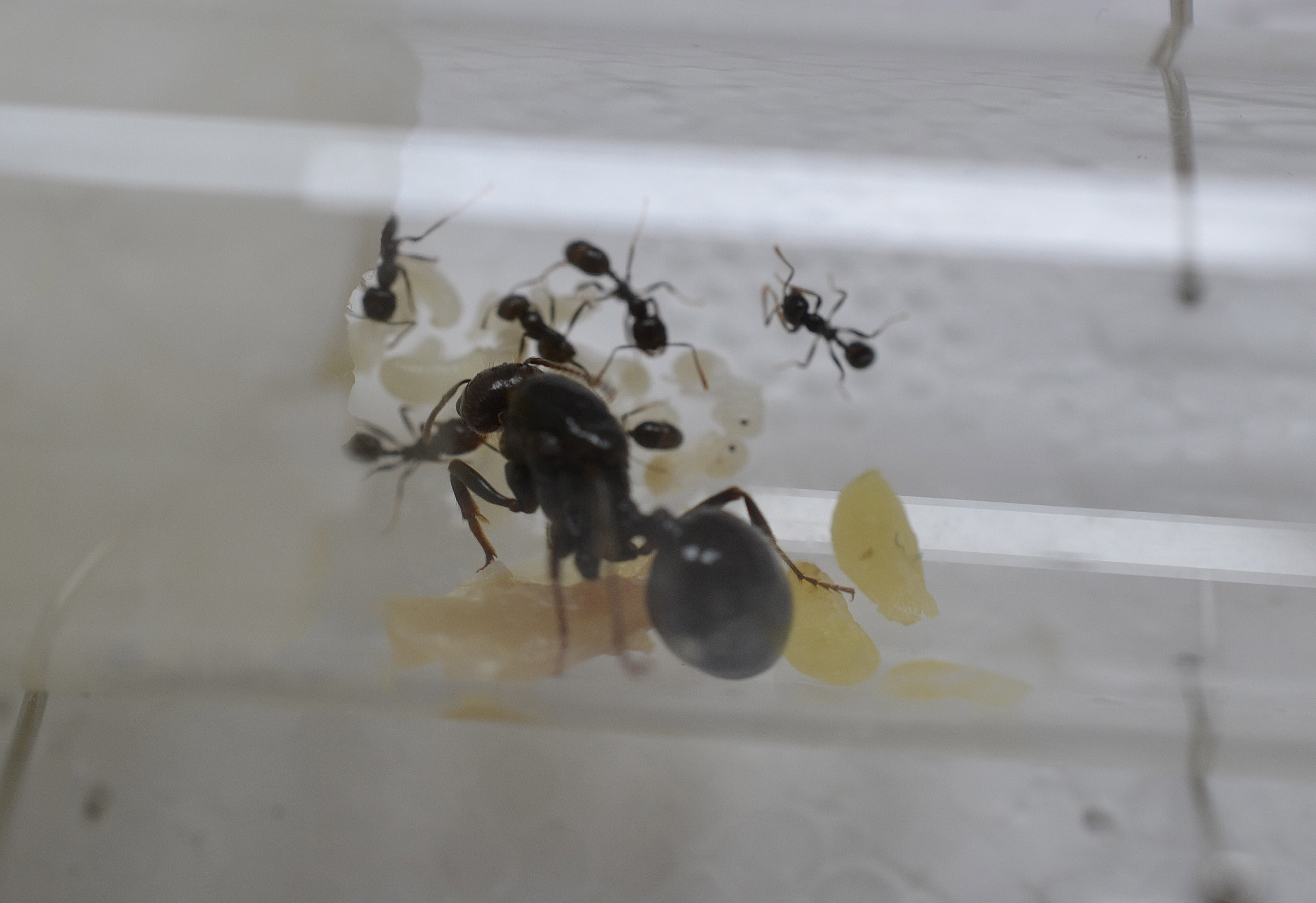 In questi giorni ho coperto parte della scatola di polistirolo con i classici 'fogli rossi' per proteggere la colonia dalla luce mentre, per quanto riguarda l'alimentazione, ho provato a somministrare due Tarme ed un Tipulide (ovviamente sempre accompagnati dai soliti semi e pezzetti di prosciutto), i quali sono stati tutti più che apprezzati.