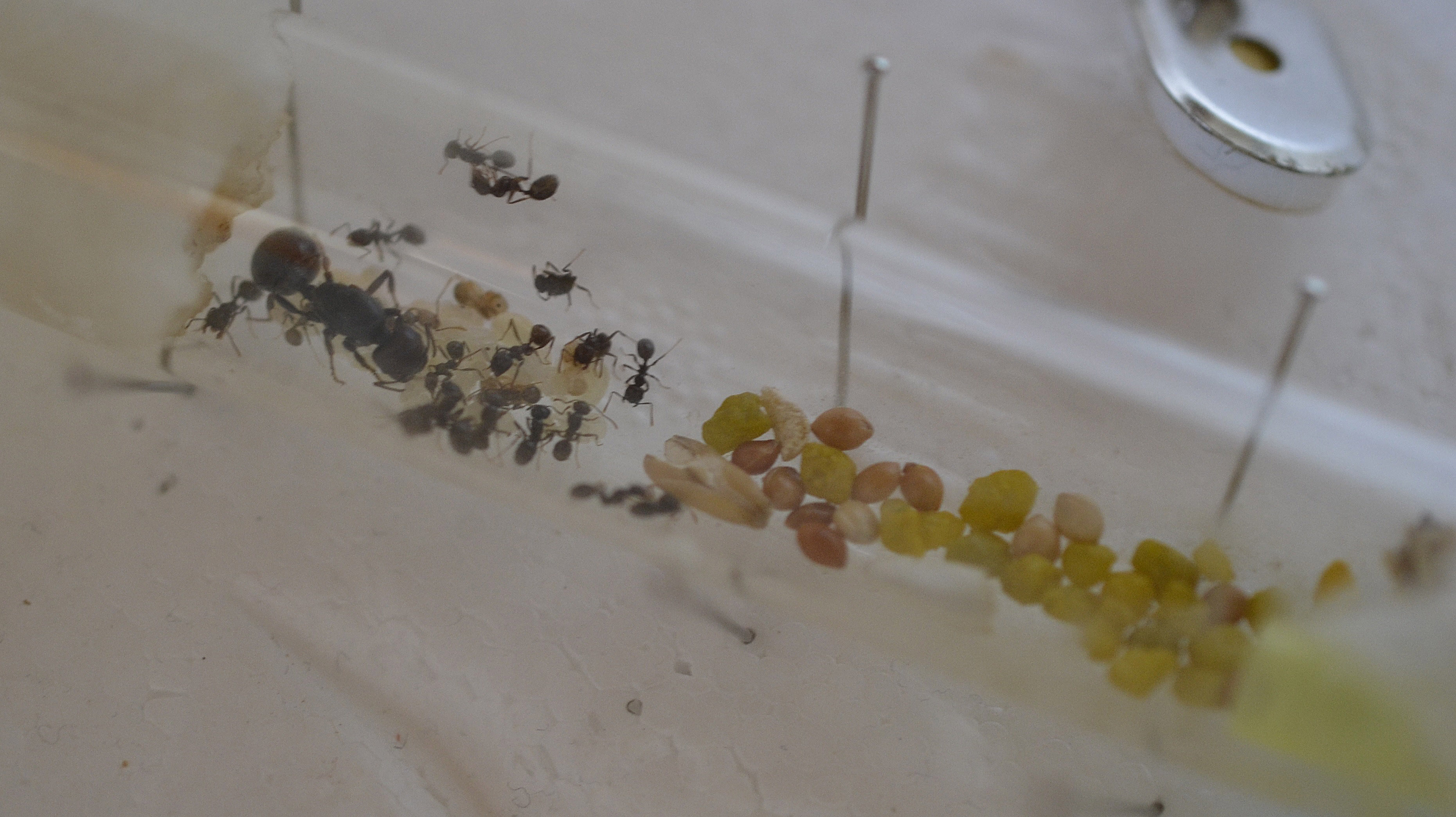 Durante questi giorni provo a somministrare altri tipi di alimenti, come un pezzetto di prosciutto crudo, uno di salame, una parte di camola e persino una goccia di siero (di proteine). Sia la camola che il siero sembrano 'deterrenti' (al primo contatto si ritraggono e fuggono), il salame viene ignorato, mentre il prosciutto è stato apprezzato moltissimo ( saranno M. barbarus di Castelnuovo