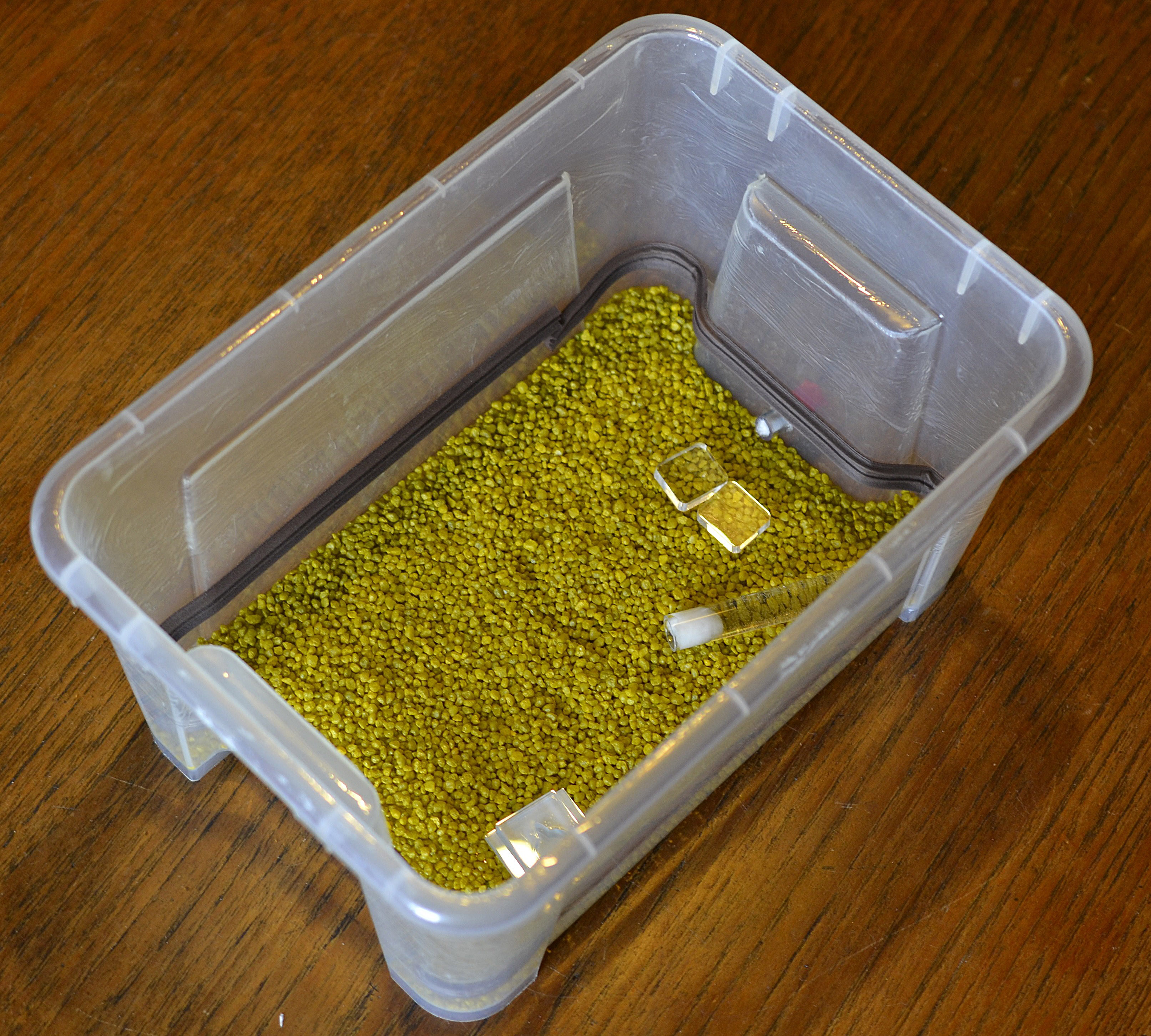 Posiziono quindi un sottile strato di ghiaino (quello da acquari), qualche piccolo sasso ed un paio di 'gettoni' di plastica per facilitare la somministrazione di cibo.Infine sposto l'intera scatola in un ripiano più basso, dove la temperatura è leggermente più alta e l'osservazione della colonia risulta più semplice.