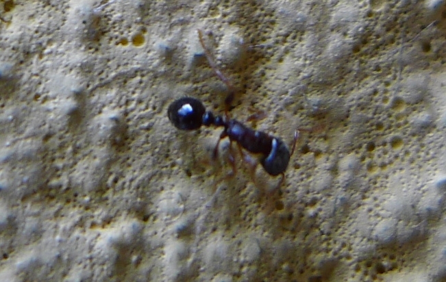 All'esterno di casa, alla base di un muro rivolto a sud, ci sono altre formiche che per forma mi sembrano Tetramonium, ma sono più piccole di quelle casalinghe e di colore bruno-rossastro anziché bruno-nerastro come le precedenti... purtroppo, così minuscole e mai ferme, sono praticamente fuori portata rispetto ai miei attuali mezzi di ripresa (fotocamera digitale compatta...)