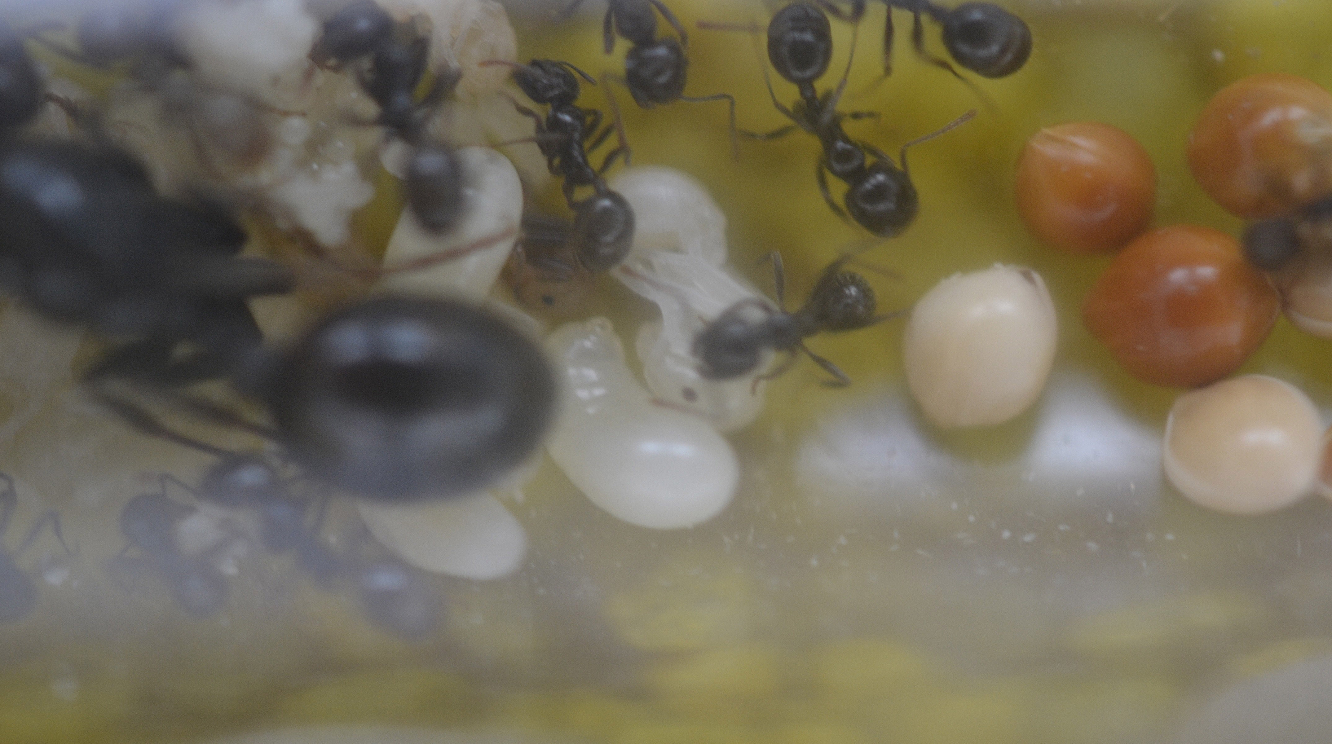 - -12.b) Una pupa (pronta a sfarfallare) viene accudita dalla regina mentre le 8 operaie le rimangono accanto. All'interno della provetta si possono notare semi (masticati e non) accumulati al centro, il pezzo di prosciutto (anch'esso posto nel 'magazzino' centrale) ed una goccia di siero posizionata su un frammento di stagnola.