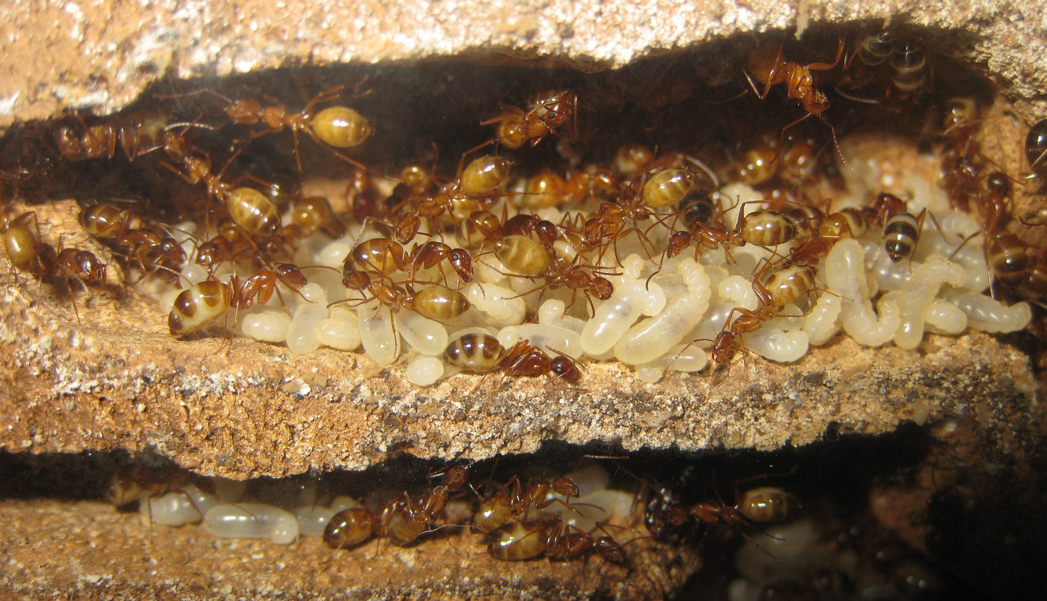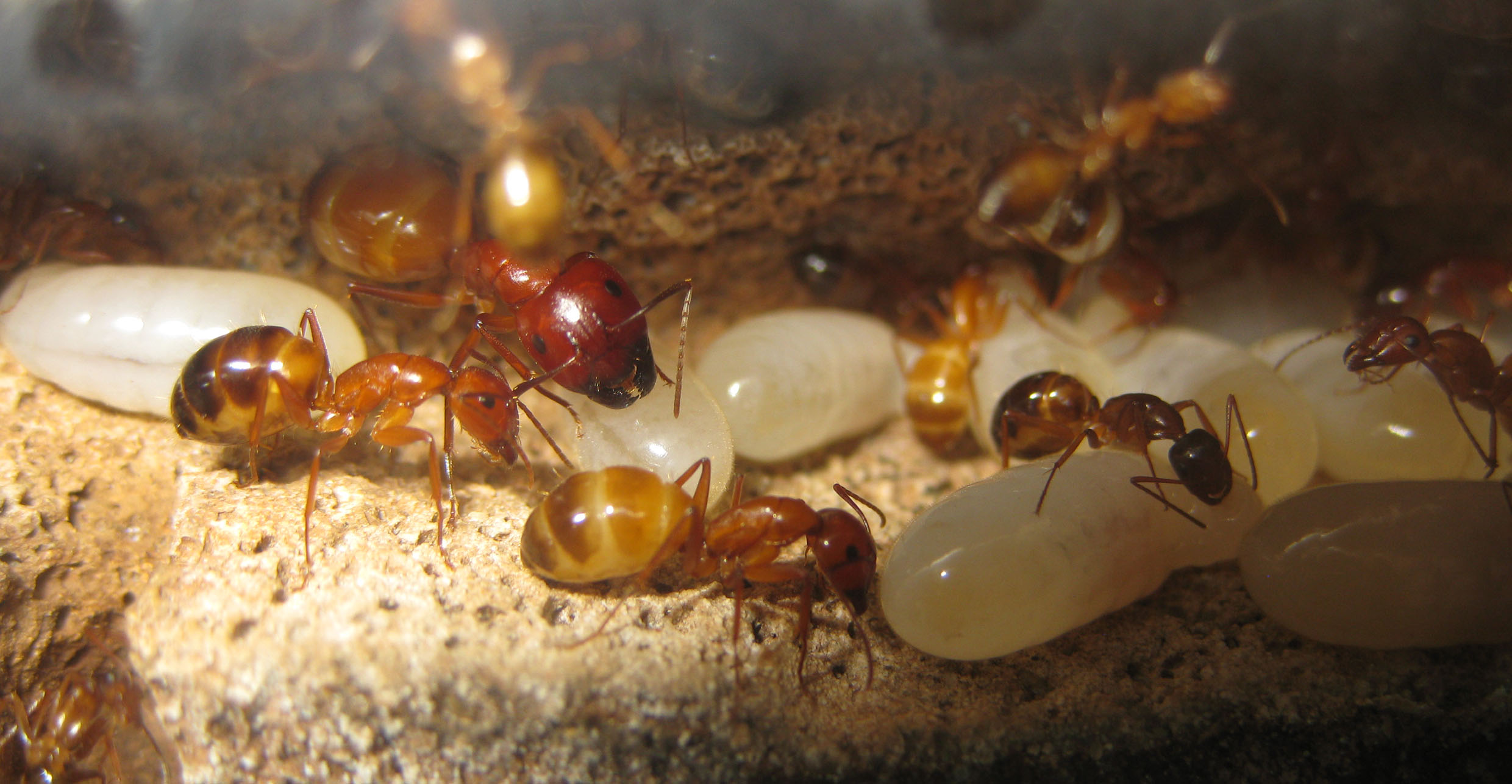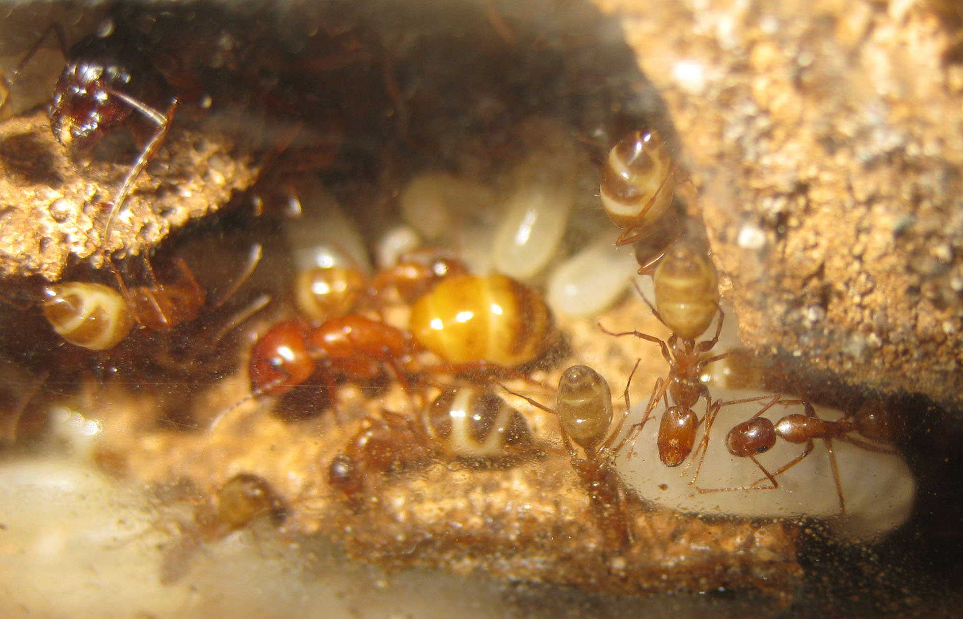 Infatti già due persone, un siciliano e un mirmecologo, hanno ammesso di non aver mai visto degli adulti della specie di questi colori. Ovvio, visto che non escono mai dal nido in questa fase! Possiamo vederli solo noi che li alleviamo, o forse scoperchiando un sasso che li ospiti, altrimenti stanno sempre nelle stanze più riparate!