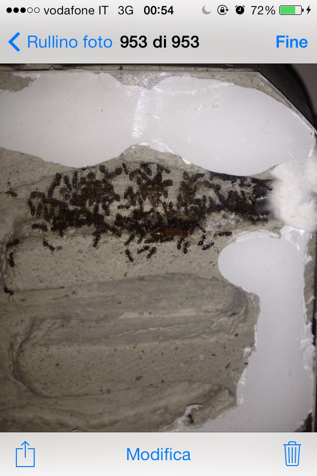 Aggiornamento del formicaio in gesso.. Hanno preso possesso della prima camera ma sono ancora poche credo.. Spero si spostino anche nelle altre. Al momento usano il tubo di collegamento per l'arena x tenere i bozzoli!!