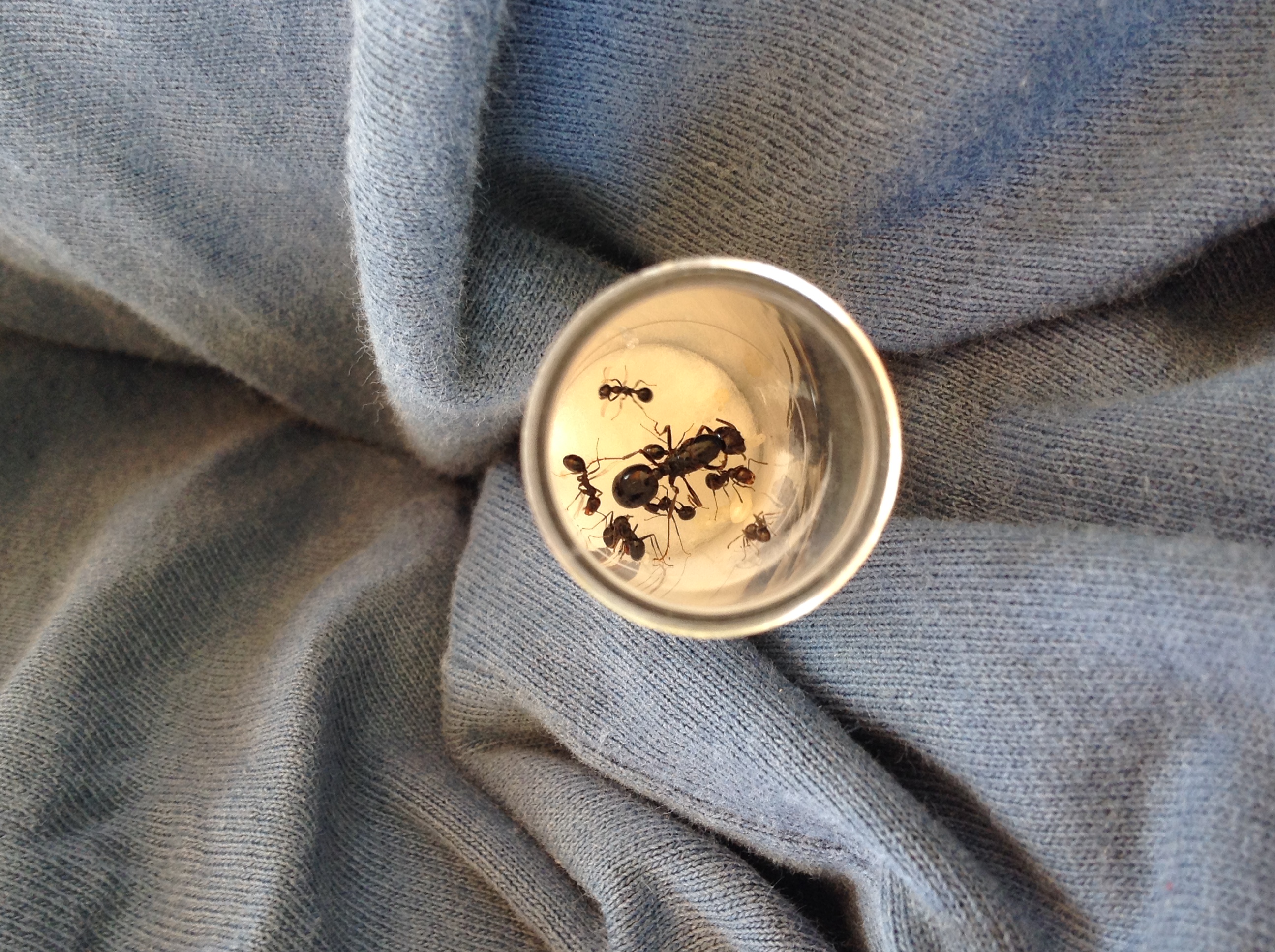 Stamattina verso mezzogiorno guardando le colonie ho controllato anche la colonietta (a) che già da un paio di giorni presentava una provetta abbastanza sporca,ma stamattina il problema era peggiore e bisognava risolverlo subito prima di incombere in altri problemi difatti l'acqua era fuoriuscita e si era riversata nella camera della colonia prendendo qualche pupa e larva con se. Decido quindi di cambiare la provetta e spostare la colonia lentamente e non in un metodo velocissimo per evitare di riversare l'acqua nella nuova provetta. Ho un idea abbastanza rapida di attaccare le provette e lasciarne la vecchia al sole e la nuova all'ombra. Le operaie non sembrano particolarmente infastidite ma la regina SI lei subito cambia provetta e una volta nella nuova la richiudo e una per una passo tutte le operaie con l'aiuto di un cotton-fiock nella nuova provetta. Noto che c'è un larvone bello grande (prima major?) e lo sposto con il resto delle pupe e un pacchetto di uova che vengono subito presi e sistemati dalle operaie.