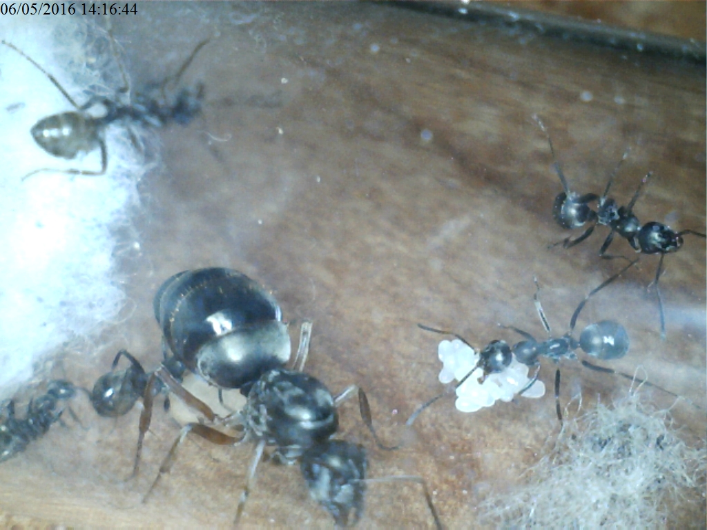 La situazione è spaventosa: la regina sforna uova tutti i giorni, le larve sono circa 120 ed alcune di esse iniziano ad impuparsi. Alimento la colonia tutti i giorni con miele e una volta a settimana offro un adulto di Plodia interpunctella, oppure comunque altri artropodi dal corpo molle. Due operaie (era chiaro, mi sono meravigliato che non siano morte prima) sono morte, probabilmente per vecchiaia.