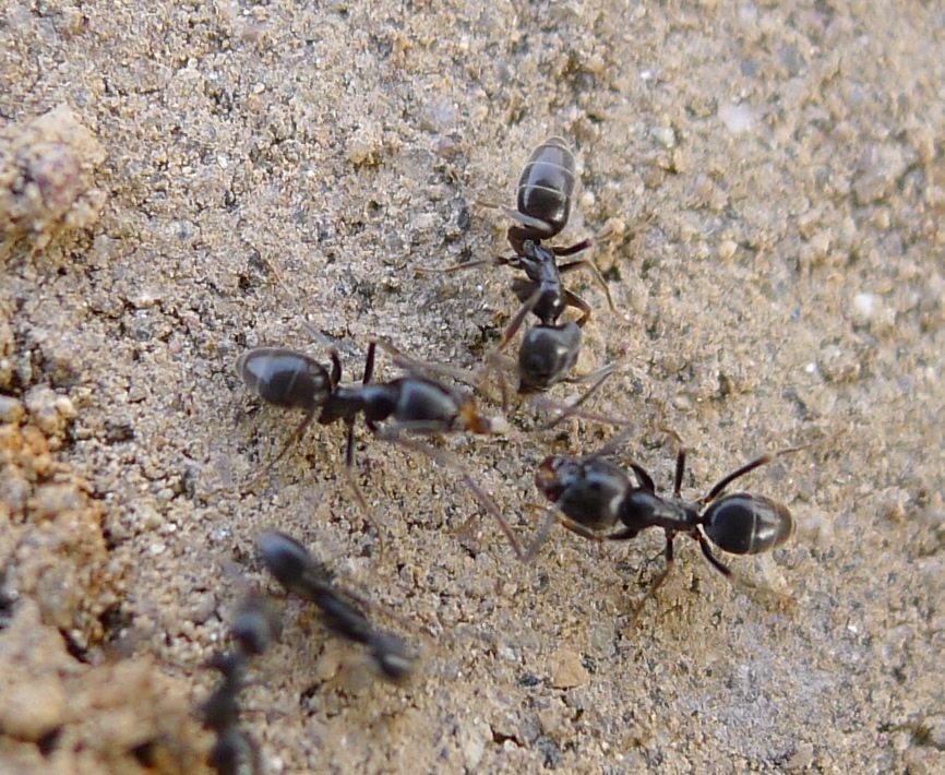 Non ho mai visto i Tapinoma nigerrimum combattere tra loro, questo farebbe piu' pensare a T. erraticum (or T. ambiguum, onestamente non so che differenze ci siano tra i due). Il polimorfismo delle operaie ed il reclutamento di massa farebbero pensare pero' davvero a T. nigerrimum.