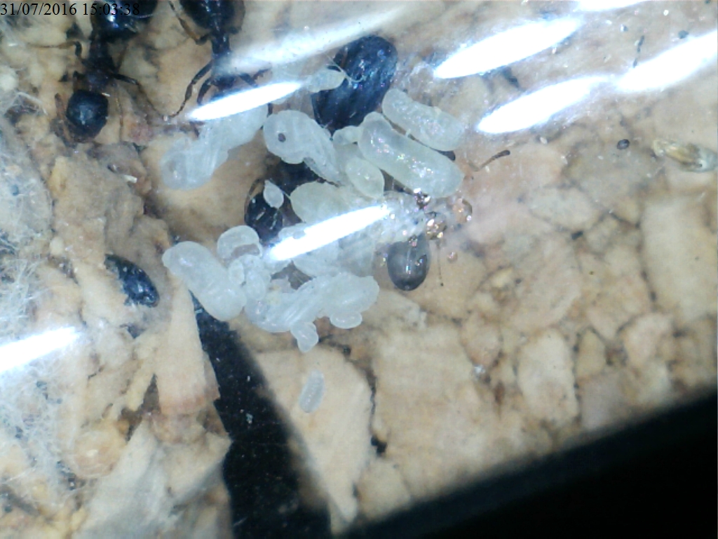 La colonia gode di ottime salute. In totale, ci sono 30 larve e 3 pupe, più qualche ovetto. Le operaie sono circa 15 (qualcuna di prima generazione è deceduta) e la colonia continua ad alimentarsi con soprattutto drosofile.