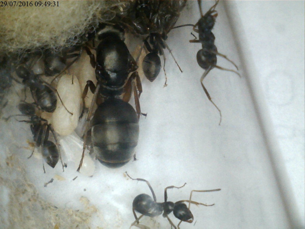 La situazione è spaventosa: la regina sforna uova tutti i giorni, le larve sono circa 120 ed alcune di esse iniziano ad impuparsi. Alimento la colonia tutti i giorni con miele e una volta a settimana offro un adulto di Plodia interpunctella, oppure comunque altri artropodi dal corpo molle. Due operaie (era chiaro, mi sono meravigliato che non siano morte prima) sono morte, probabilmente per vecchiaia.