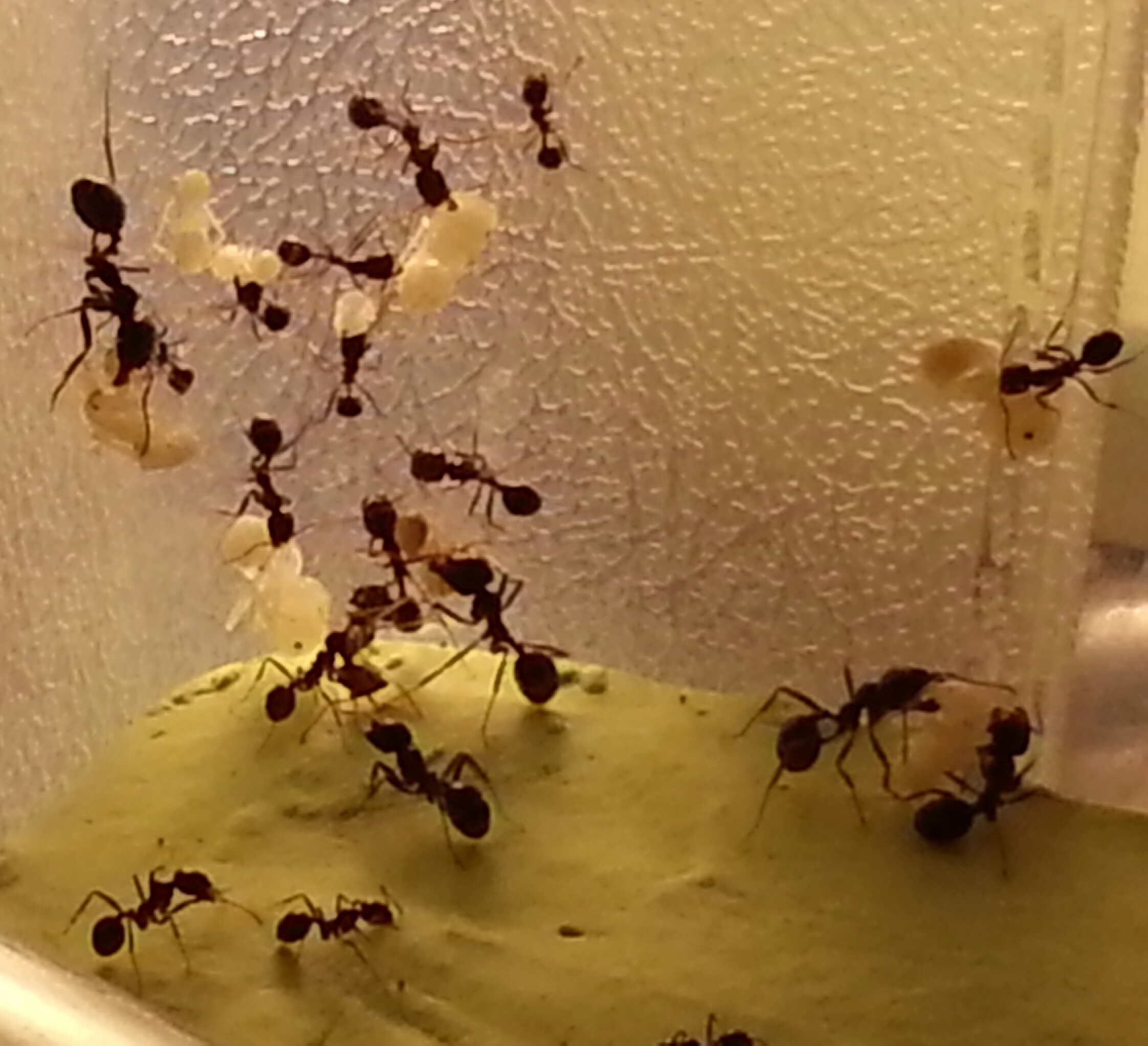 Questo strano comportamento continua, le operaie stanno sparpagliando per tutta l'arena uova larve e pupe, molte le ho trovare attaccate alll'antifuga.Non riesco propio a capire il perche` di questo comportamento, ne come possa impedirlo.A qualcuno e` mai capitato?