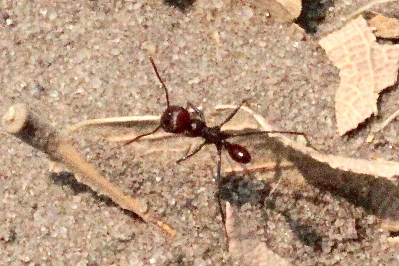 Queste formiche erano veramente interessanti... velocissime come le Cataglyphis del deserto, fotografarle è stata un'impresa... Ad ogni modo la caratteristica che saltava all'occhio era il gastro sottilissimo e il capo grosso. Il colore amaranto e grigio scuro: le ho trovate ovunque, sia nella foresta umida dell'Okavango sia nel deserto del Kalahari. Scavavano nidi nella sabbia e avevano una lunghezza 8-10mm.