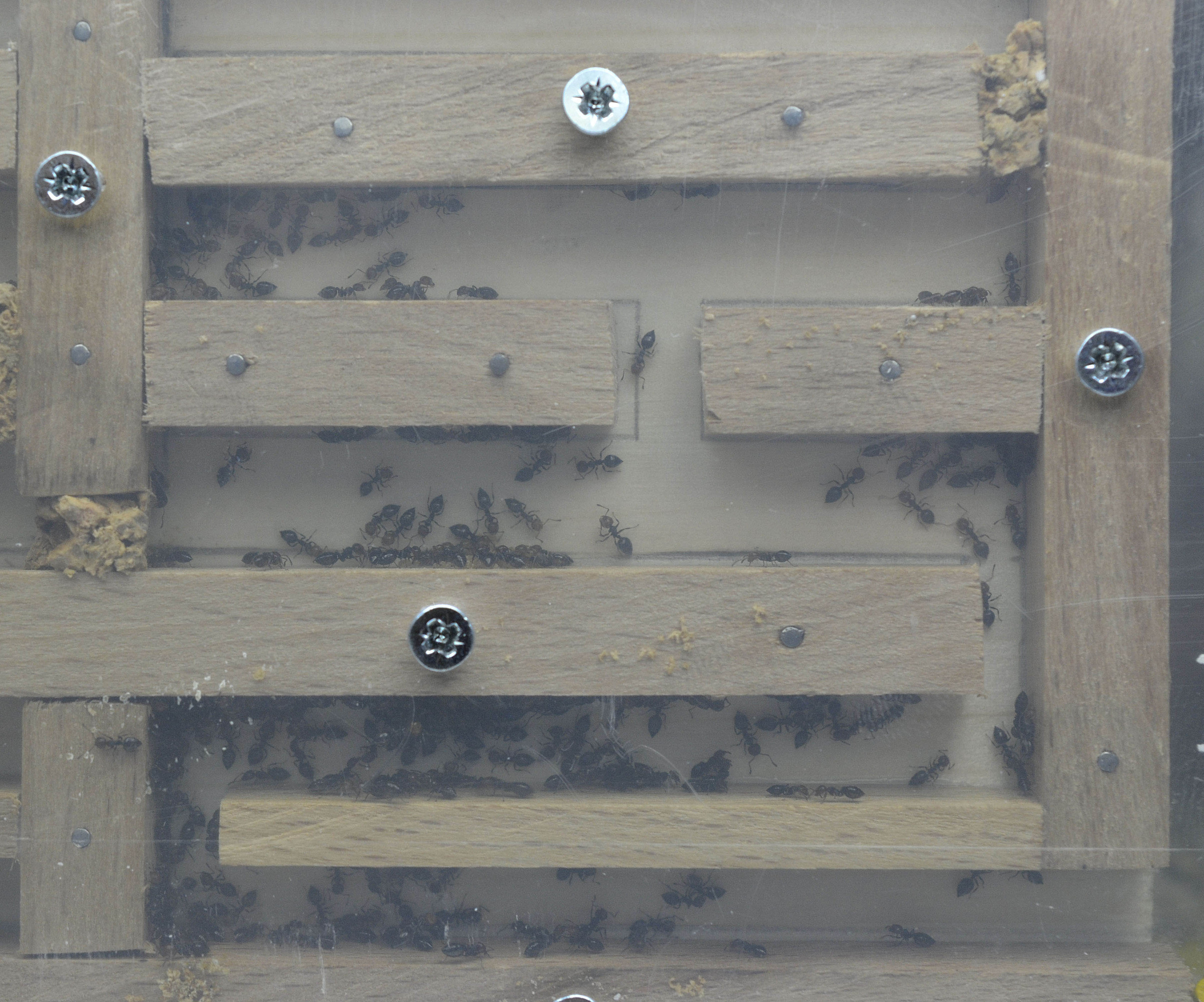 Appena portate in casa le operaie e la regina avevano occupato alcune stanze del formicaio ma subito dopo l'aggiunta del tappetino riscaldante si sono sparpagliate sul fondo in gesso, nelle due stanze inferiori del nido (scavando il gesso sottostante) e nella provetta che funge da serbatoio. In quest'ultima si è definitivamente trasferita la regina che continua a deporre mentre le operaie che l'accudiscono hanno creato un 'tappo' di sughero e gesso che chiude l'ingresso del serbatoio.