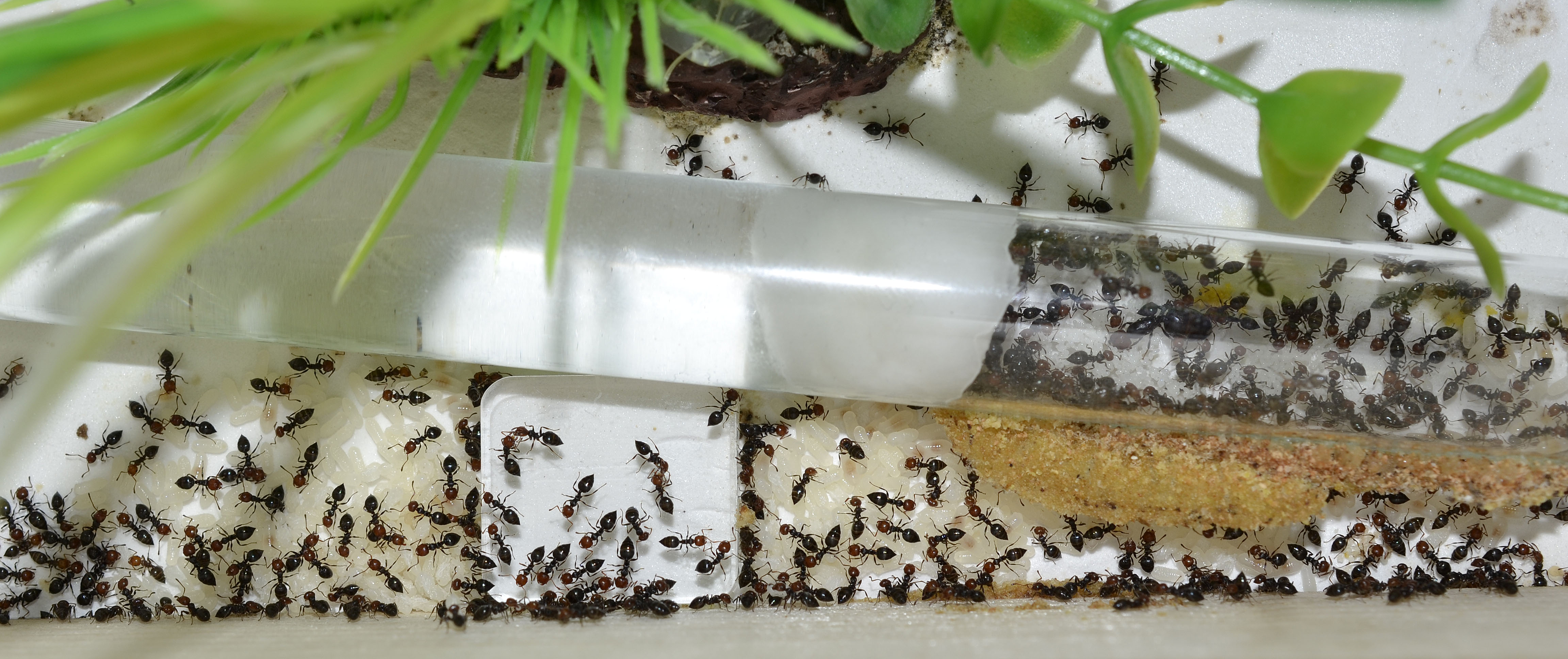 ). La popolazione del formicaio è decisamente aumentata, lasciando la provetta originale molto più libera (rimane principalmente una grossa parte della covata ed alcune operaie), la regina invece non la vedo più da molto tempo