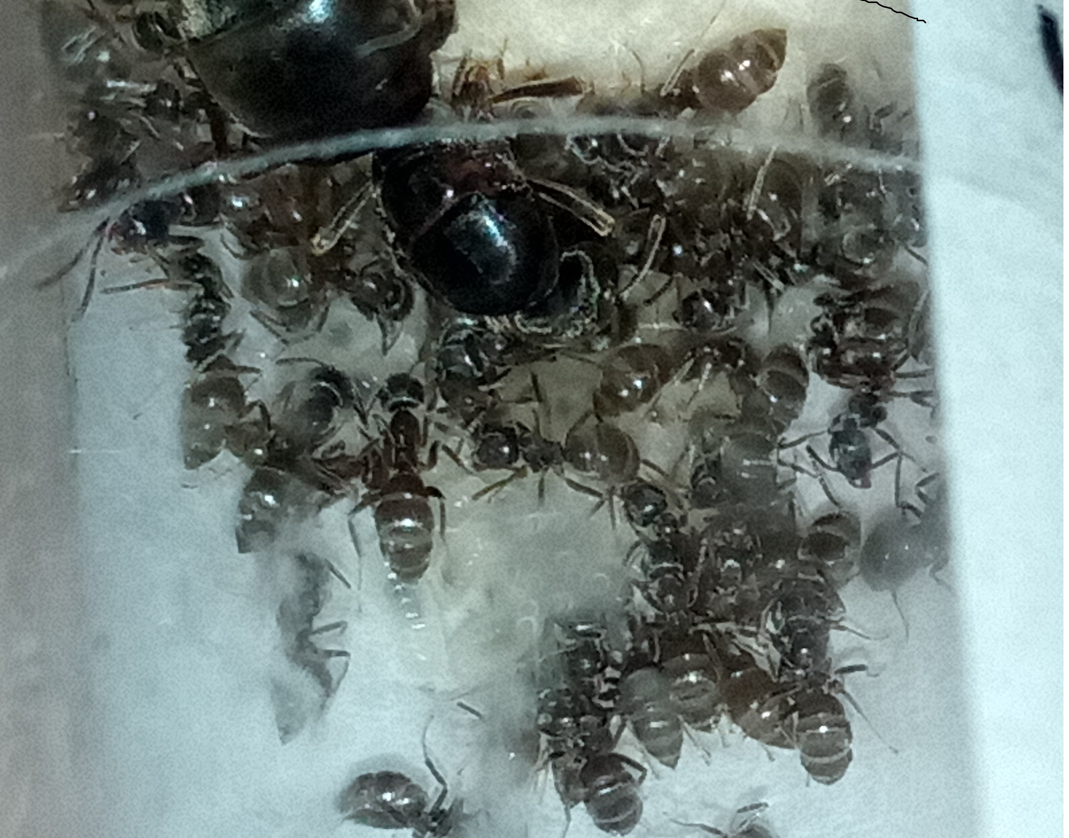 Scrivo per una identificazione di routine relativa alla mia prima colonia in allevamento... Regina trovata il 28-6-2016, zona Rimini campagna, tardo pomeriggio,clima soleggiato, caldo. Misura, circa 10mm. Sono arrivato all' ottavo mese di allevamento. Colonia risvegliata da circa 15gg dopo ibernazione di 2.5mesi...Al momento si contano circa 50/60 operaie (intorno ai 3mm) + un buon numero di uova e larve. Ibernazione trascorsa senza problemi. Io le sto allevando come Lasius sp. ma da neofita mi piacerebbe avere un parere più esperto ora che il loro numero inizia a farsi consistente! Forse Lasius niger ?