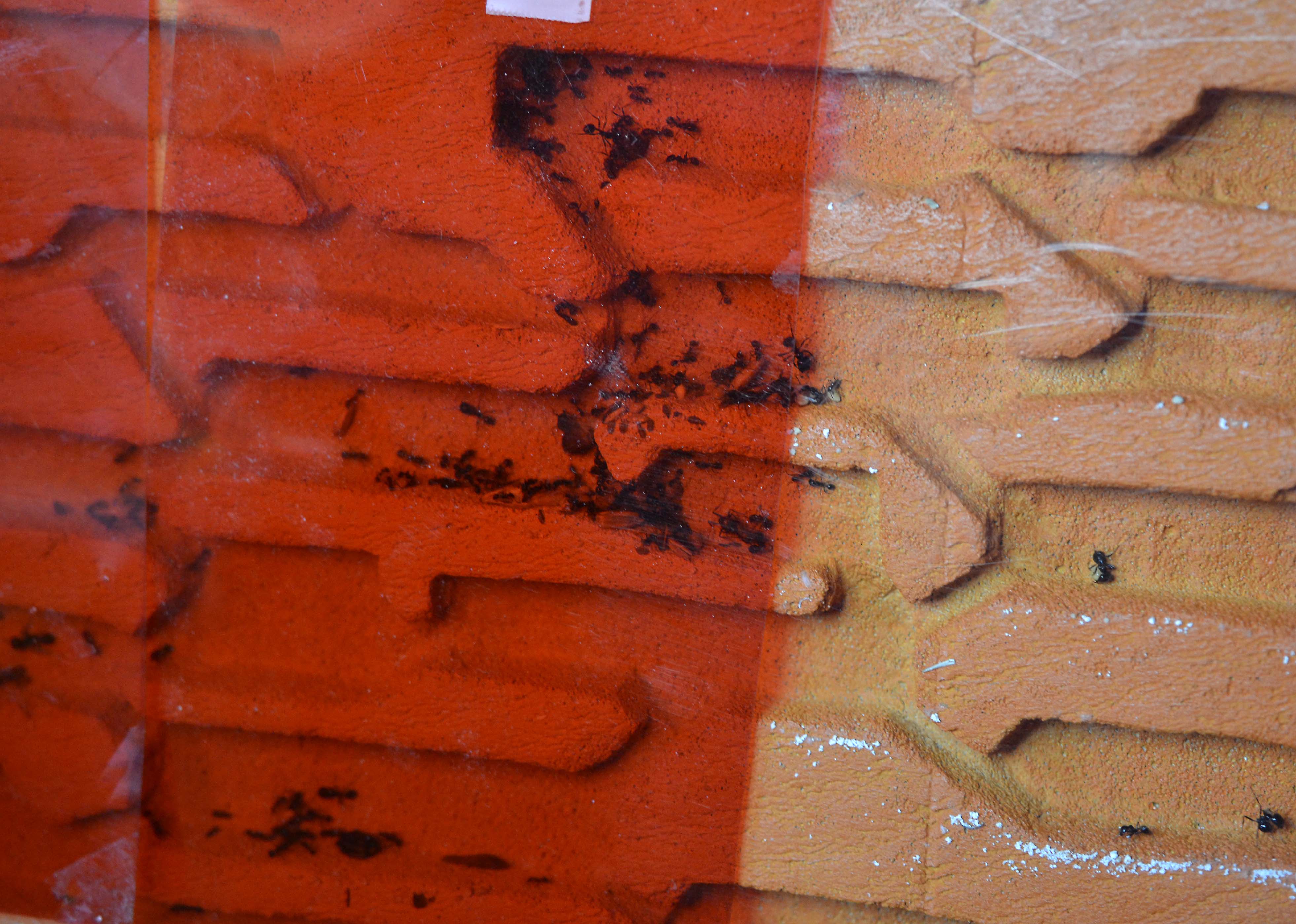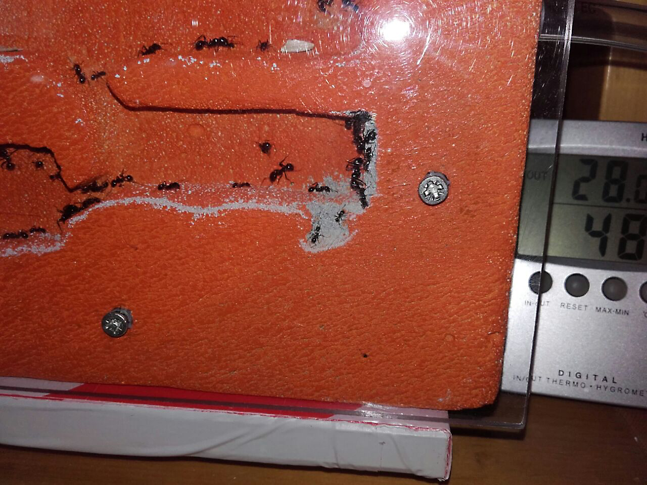 Passata un'ora ho notato alcune operaie che stavano scavando l'angolo in basso a destra (il più umido) senza un motivo particolare. Avevano fatto la stessa cosa anche durante il trasloco nel nido attuale (forando subito la parte inferiore e raggiungendo il serbatoio). Per evitare la possibile (e più che prematura) fuga ho applicato ai rispettivi lati una lastra di plexiglass utilizzando la colla a caldo. Gli scavi, infatti, stanno procedendo fin troppo velocemente e per cercare di limitarli ho deciso (dopo aver chiesto consigli in merito a GianniBert che ringrazio molto) di lasciare secca la parte del blocco interessata, umidificando ogni tanto solo l'angolo a sinistra (a disposizione ci sono sempre tre provette d'acqua). Adesso non resta che aspettare e vedere