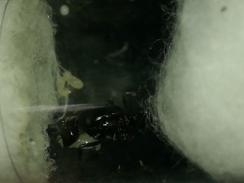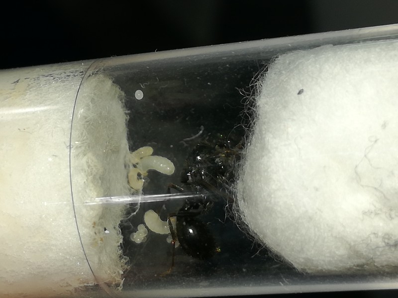 Eccola qua, foto appena fatta ed ho scoperto che ha deposto 3 uova, lunghezza 15 mm neosciamata il 25/04/2017, ti allego i dati precisi in busta. Per lo scambio preferirei una regina di Messor barbarus che ha già iniziato a deporre, se sono presenti larve è meglio. Fammi sapere, grazie.