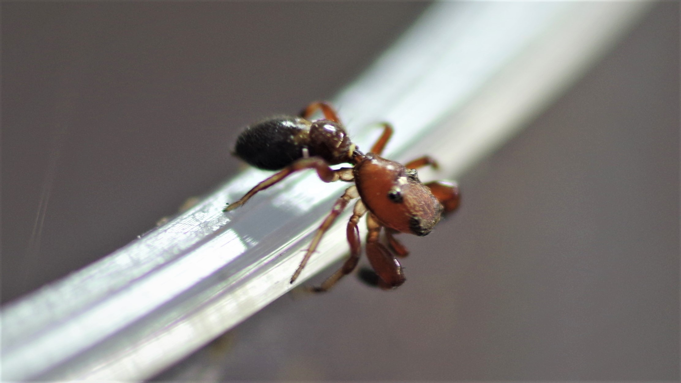Mi è capitata per caso sott'occhio questa foto scattata in Oklahoma (USA). Ha attirato molto la mia attenzione perché non avevo ancora visto Salticidi mirmecomorfi che imitano chiaramente delle Crematogaster. Direi che il bersaglio del mimetismo sia inequivocabile: quell'opistosoma a cuore lascia pochi dubbi e ci sono varie specie di Crematogaster con questa colorazione da quelle parti. La C. laeviuscula per esempio è comunissima lì.