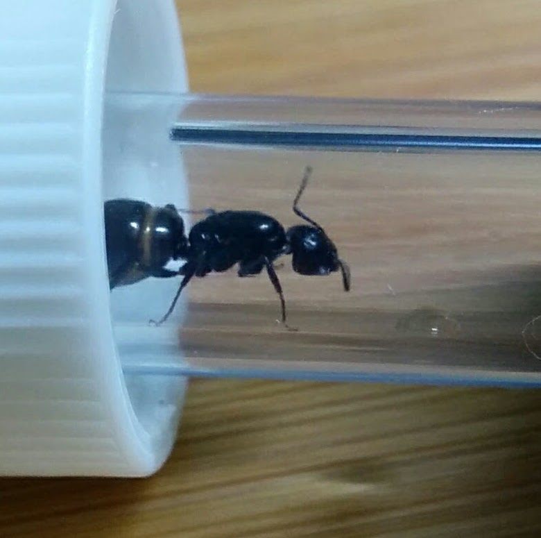 Dopo 24 ore la formica si è posizionata (ed ha portato le sue 6-7 uova) nella cannuccia di raccordo, in un punto stretto (si gira a fatica) e nascosto.