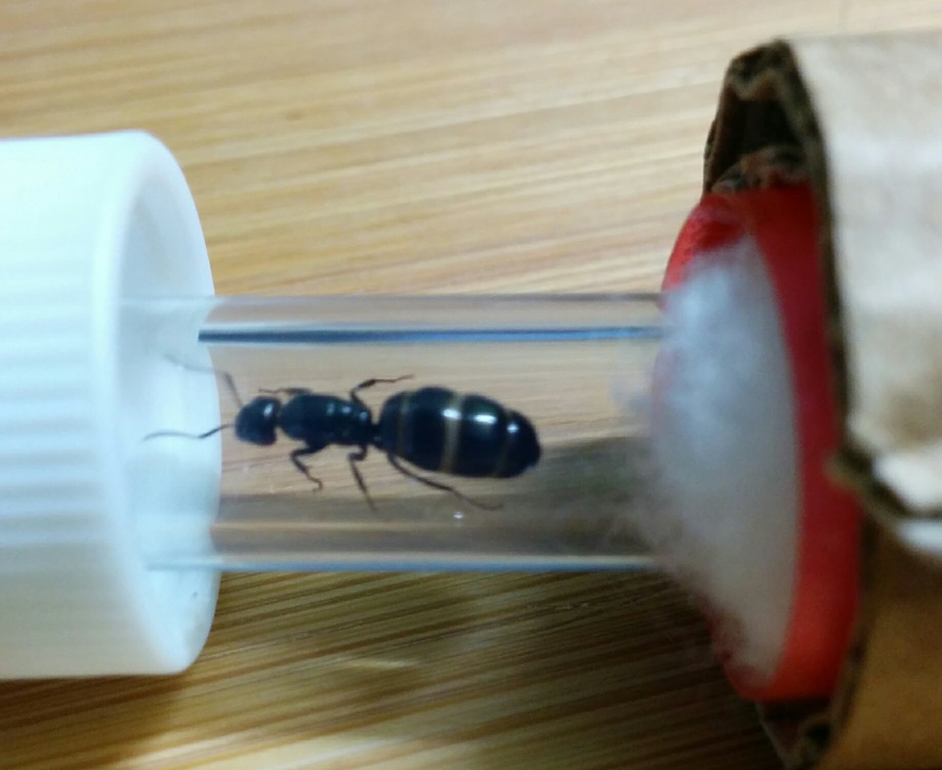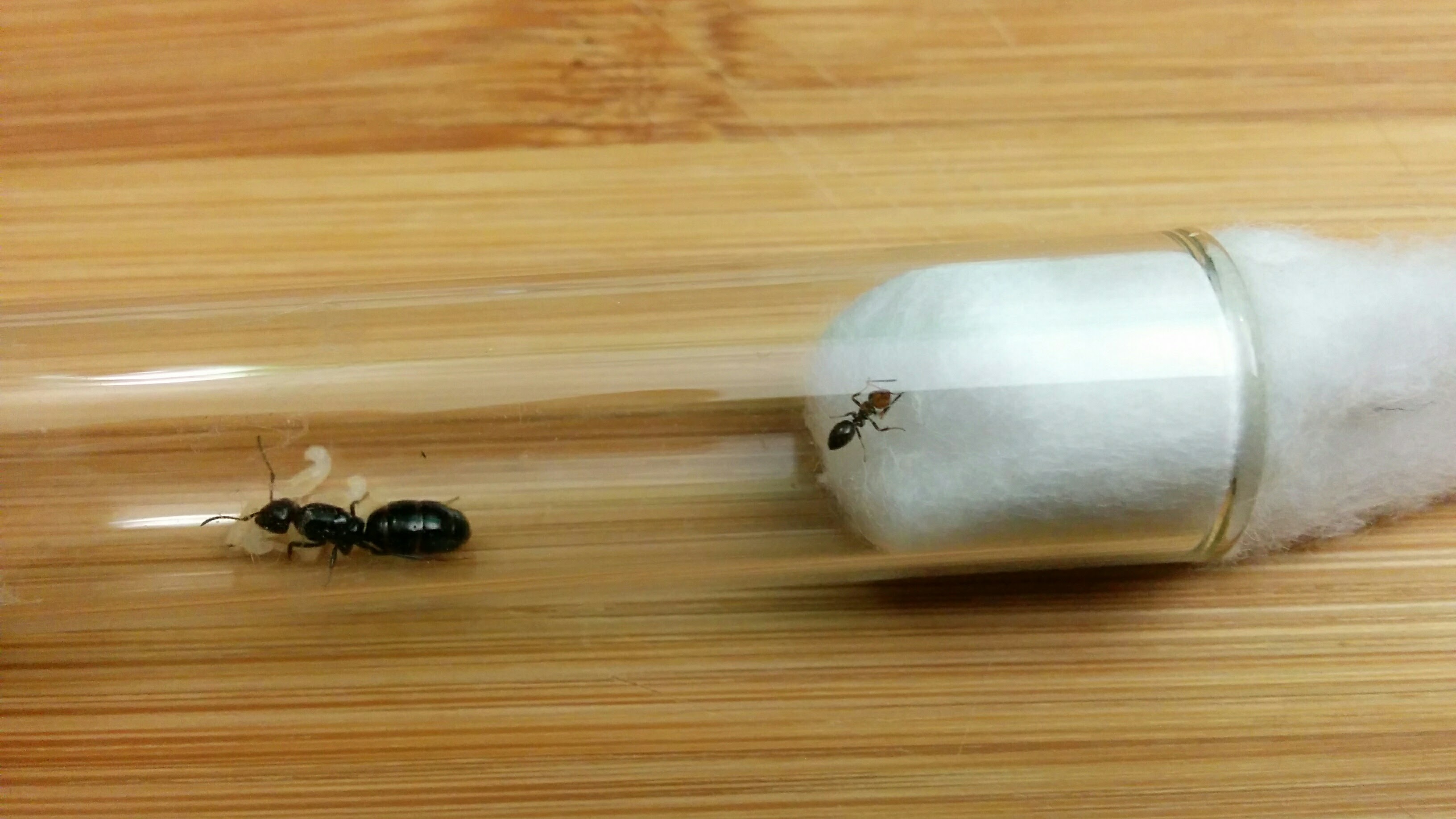 Da un giorno ho staccato la vecchia provetta, ho messo un po' di ovatta alla cannuccia, e posizionato tutto in una scatola buia. Ora quindi c'è la nuova provetta con la cannuccia attaccata e la formica staziona nella cannuccia (allego foto). Cosa devo fare per rimediare?