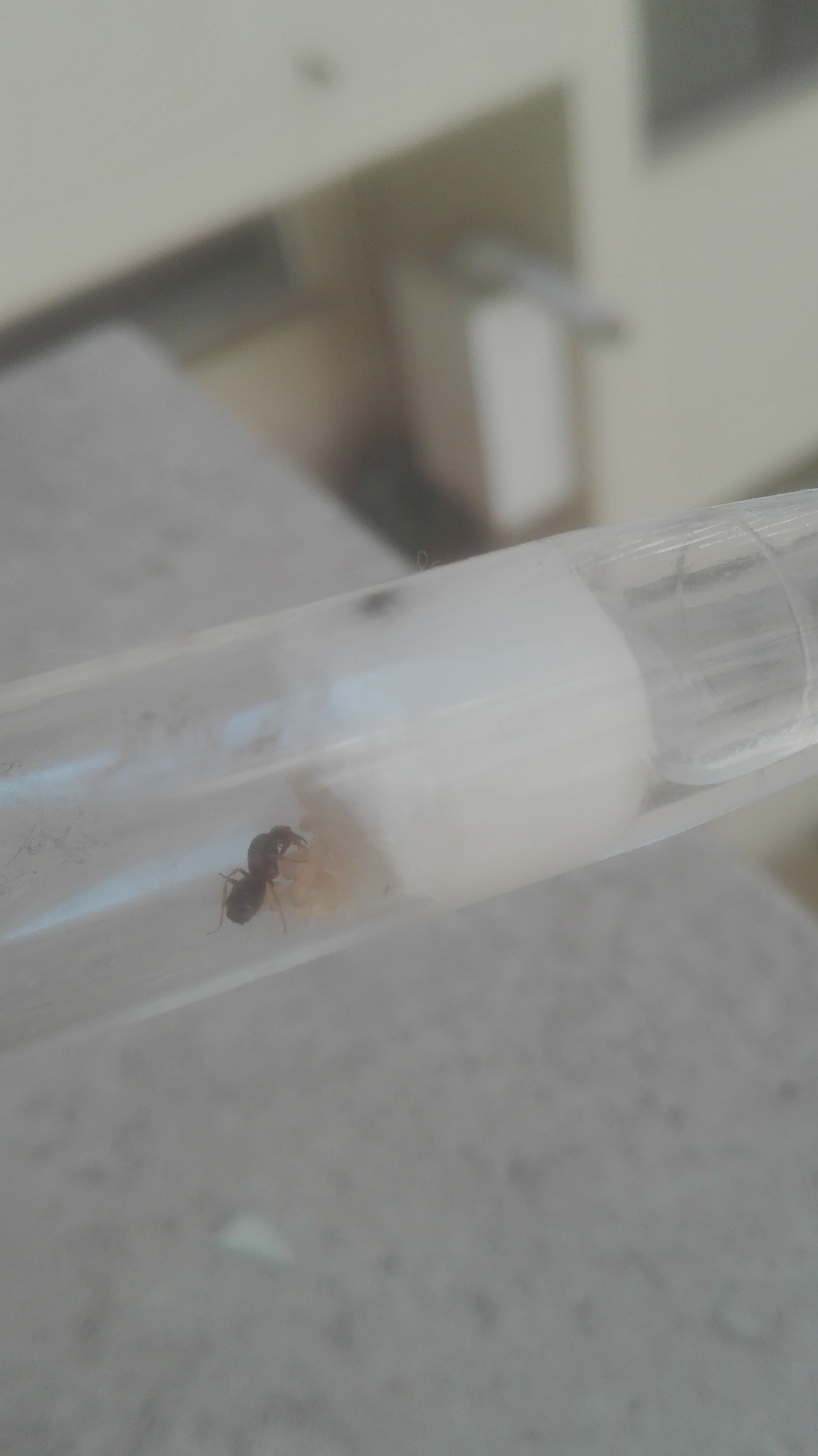 Da un bel mesetto ho questa bellissima regina di Lasius. Dopo una settimana ha deposto almeno 40 uova! Ha fatto un mucchio enorme! Inizialmente pensavo fosse una Tapinoma ma mi sono accorto che è Lasius sp. dalle pupe, che sono nel bozzolo. Oggi infatti conta 10 pupe. Volevo chiedervi se potevate identificare la specie esatta. Grazie in anticipo!!!