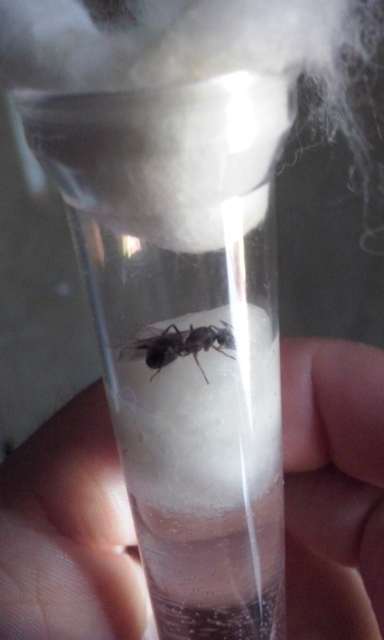 Ieri mattina ho liberato la regina poco distante da dove l'avevo trovata. Dopo cinque giorni dalla cattura non solo non si era ancora dealata, stava anche sfilacciando furiosamente il tappo di cotone. Sono comunque curioso di capire a quale genere appartiene, così ho fatto un paio di foto nel momento della liberazione. Spero che con queste si riesca a dire con certezza se è Lasius sp. o Formica sp.