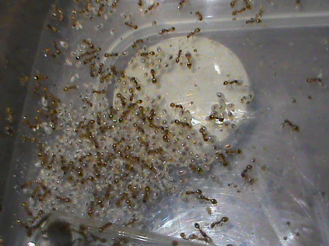 Bene bene le operaie sono attive da un paio di settimane e quindi le ho messe in una nuova arena pulita e con antifuga nuovo ed ho ricominciato a fornire proteine, subito gradite ed assaltate in massa.