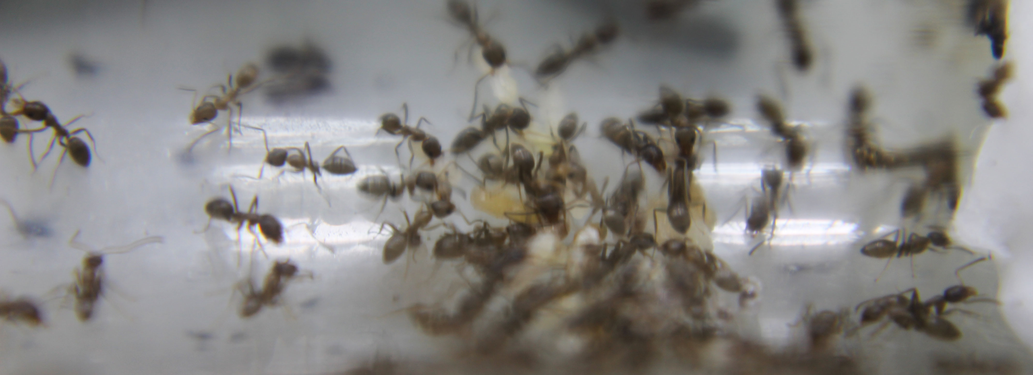 Malgrado l'arena si trovi in condizioni disastrose ( muffe originate dalla provetta del miele, in più sporcizia varia e un po' di cadaveri) la colonia ha resistito anche se ha rallentato un po' i ritmi (forse per scarsità di risorse) delle sei regine che avevo introdotto ne ho viste solo tre (una morì prima della mia partenza) ma hanno deposto tranquillamente e c'è un bel po di covata e larve, le operaie sono sull'ordine della cinquantina e appena tornato ho fornito miele fresco e cibo per gatti umido (si sono fiondate praticamente subito).