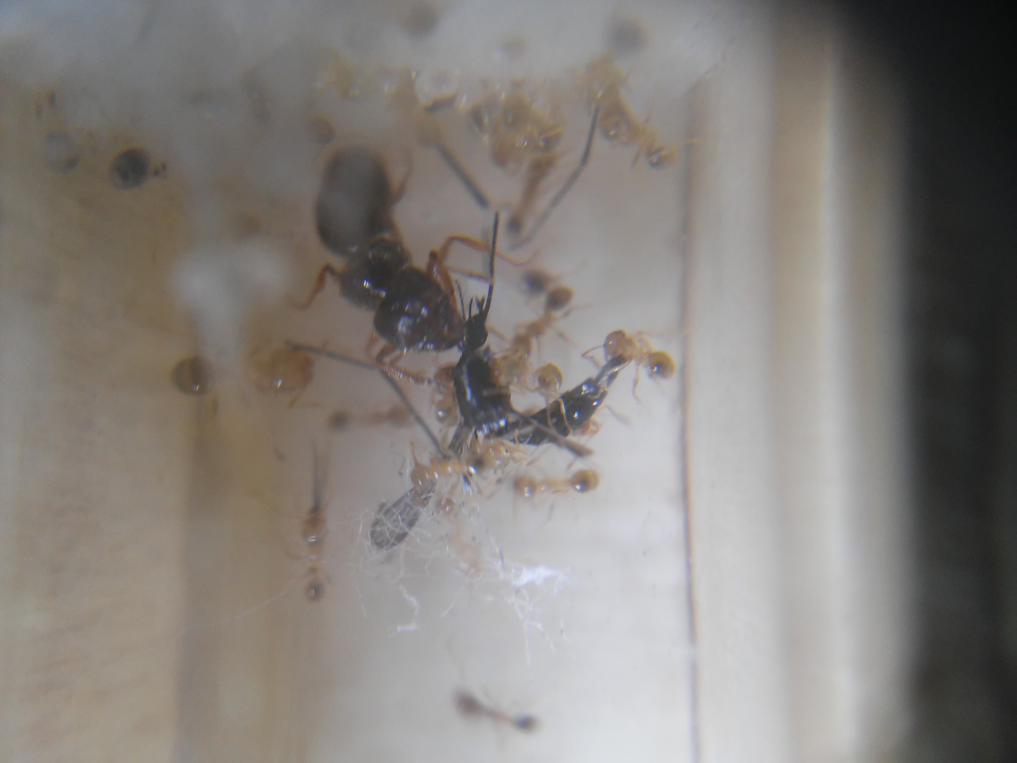 Qui la colonia B che trasporta un'ape verso il nido. Ritengo divertente il fatto che loro tentino di far entrare qualsiasi preda nel nido, comportamento molto diverso dalle colonie che ho di altre specie. Visto che le prede sono regolarmente troppo grandi, cominciano ad essere smembrate ed entrano a pezzi testa, zampe e poi il resto. Dopo un paio di giorni i rifiuti sono in arena (nel tappo!) e li rimuovo. Una vespa è stata invece completamente ignorata.