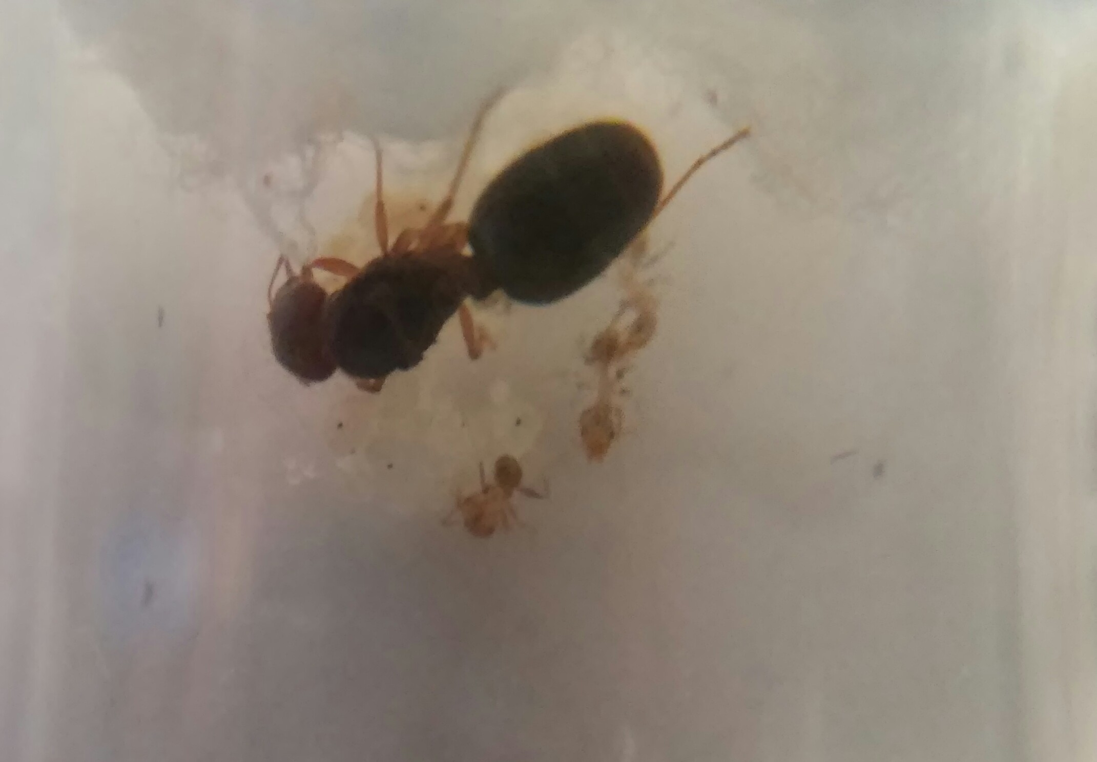 Riguardo al comportamento, i soldati "vecchi" (o meglio il soldato vecchio di ogni colonia) cominciano ad uscire dal nido non appena viene proposto cibo al di fuori. I nuovi nati fanno invece da replete e spostano uova qua e là. Allego una pessima foto per far notare le differenti dimensioni tra il primo e il secondo soldato, che sono davvero notevoli.
