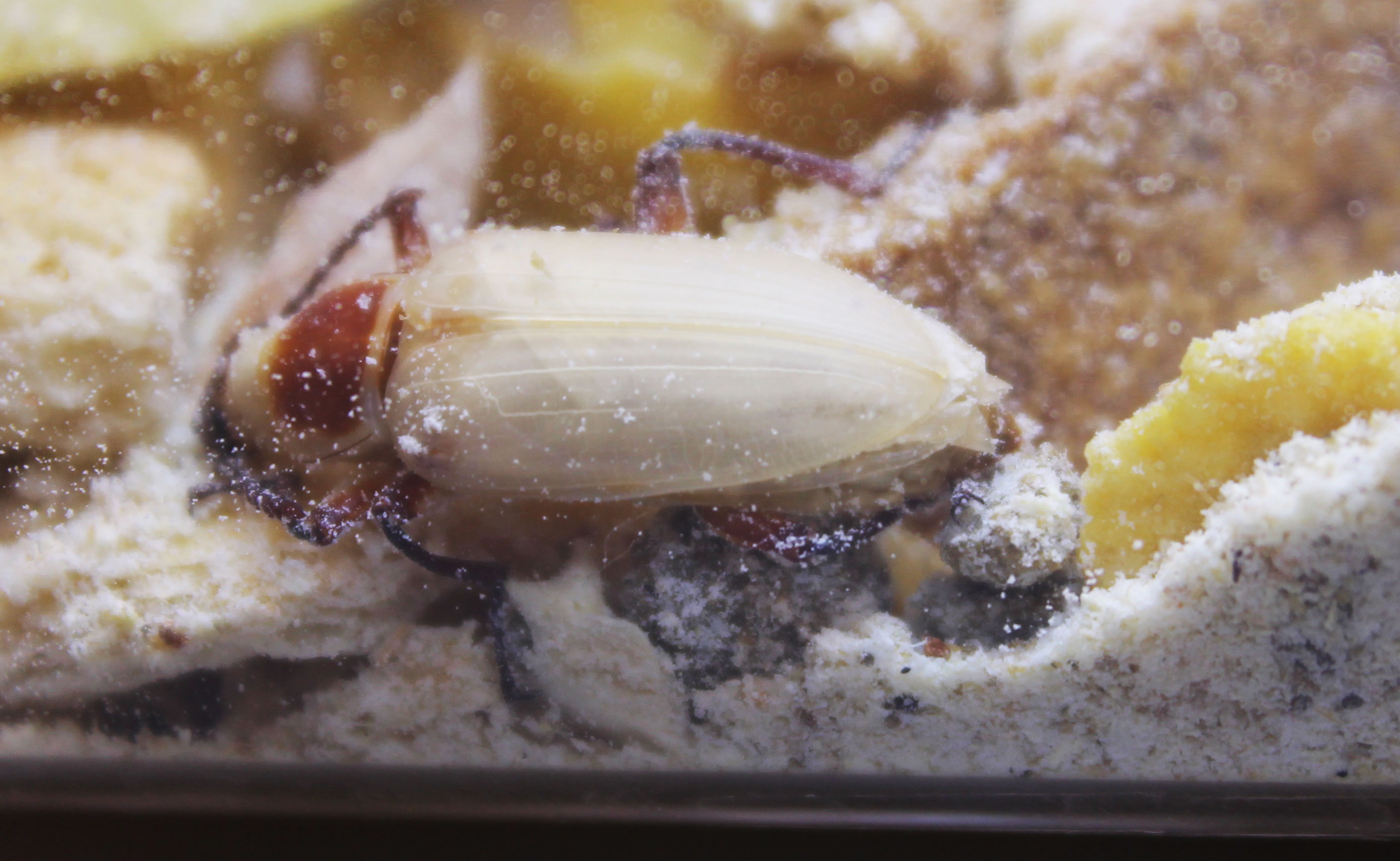 Ci ho provato, ma non viene via, a differenza delle altre mute che sembrano carta praticamente, questa è tipo gommosa ed elastica e non viene via, tra l'altro col passare dei giorni le elitre sono rimaste in posizione "pupale" (cioè abbassate tra il secondo e il terzo paio di zampe) e ormai si sono indurite in questo modo, quindi anche se riuscissi a sfilare il resto dell'involucro pupale il ventre sarebbe del tutto scoperto, mi è parso strano perchè era alle stesse condizioni di temperatura e umidità (praticamente quasi assente) degli altri nell'incubatrice.