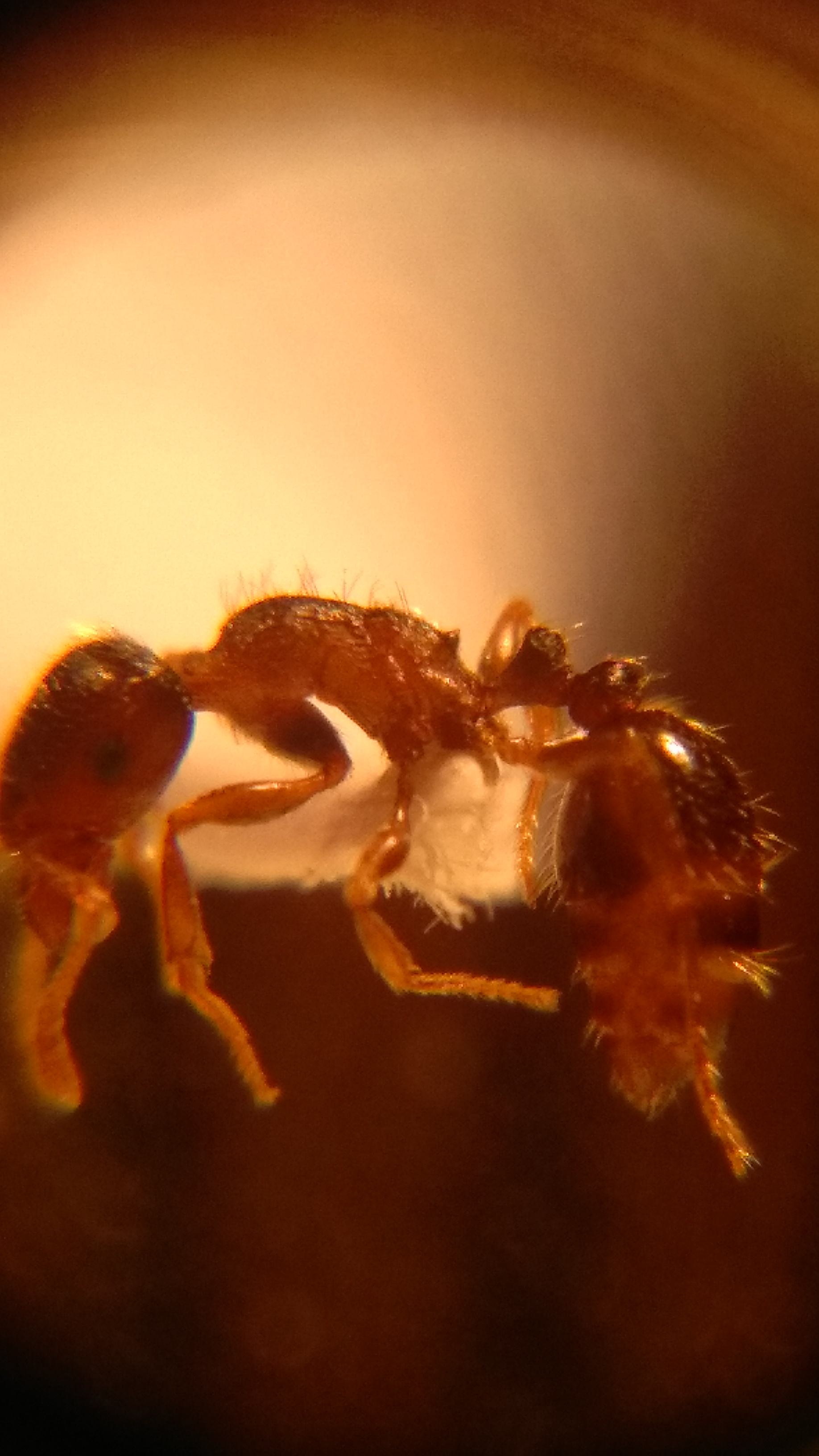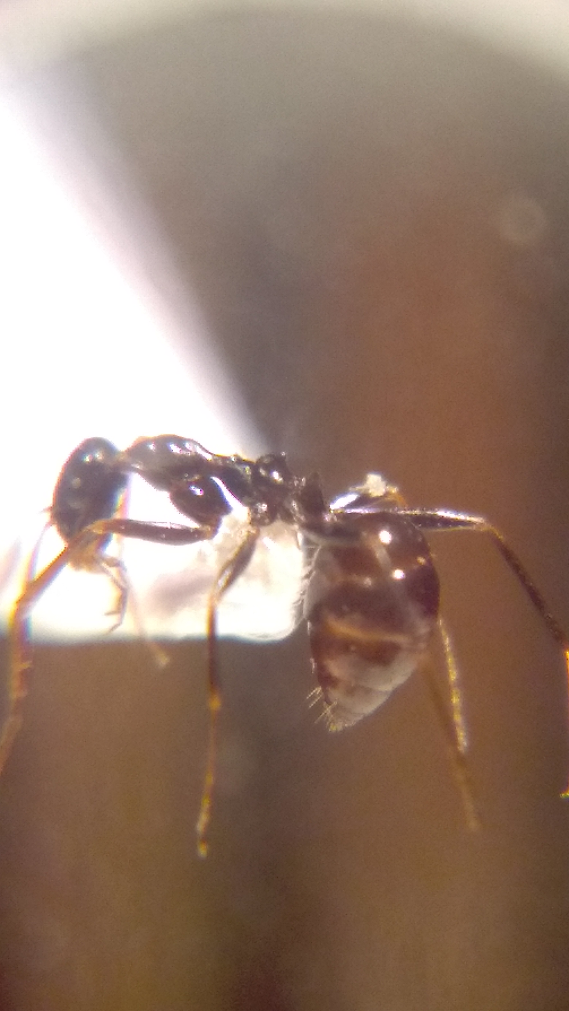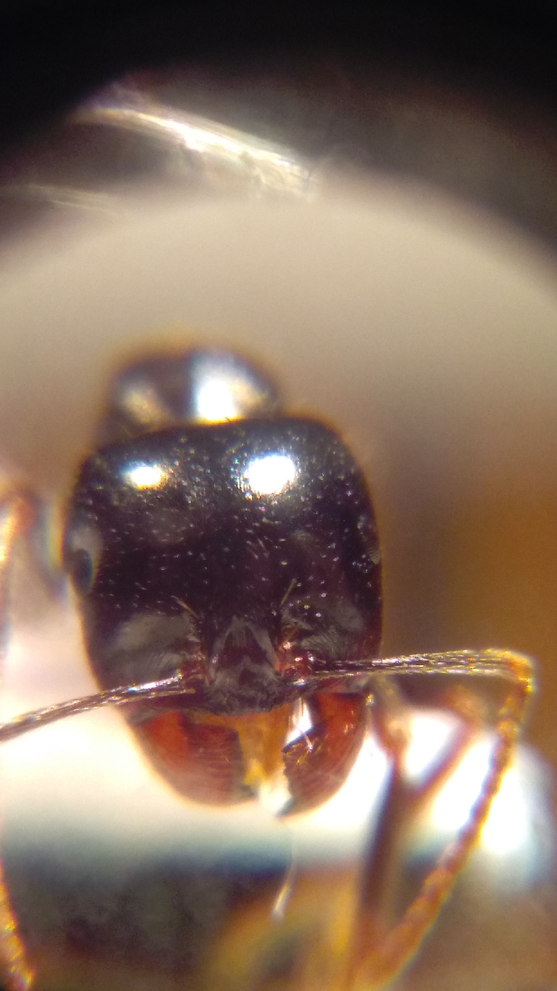 Poi c'è un Monomorium che, come Andrea ha facilmente intuito, appartiene al gruppo salomonis. Si può anche determinare la specie: la chitina è opaca, non lucida come in salomonis, e forma di peziolo e testa escludono alcuni taxa simili, si tratta di M. subopacum. E' una peste invasiva ubiquitaria, però mi fa capire subito (appurato che mi trovo in Europa o al massimo poco più intorno) che stiamo parlando di una zona mediterranea.