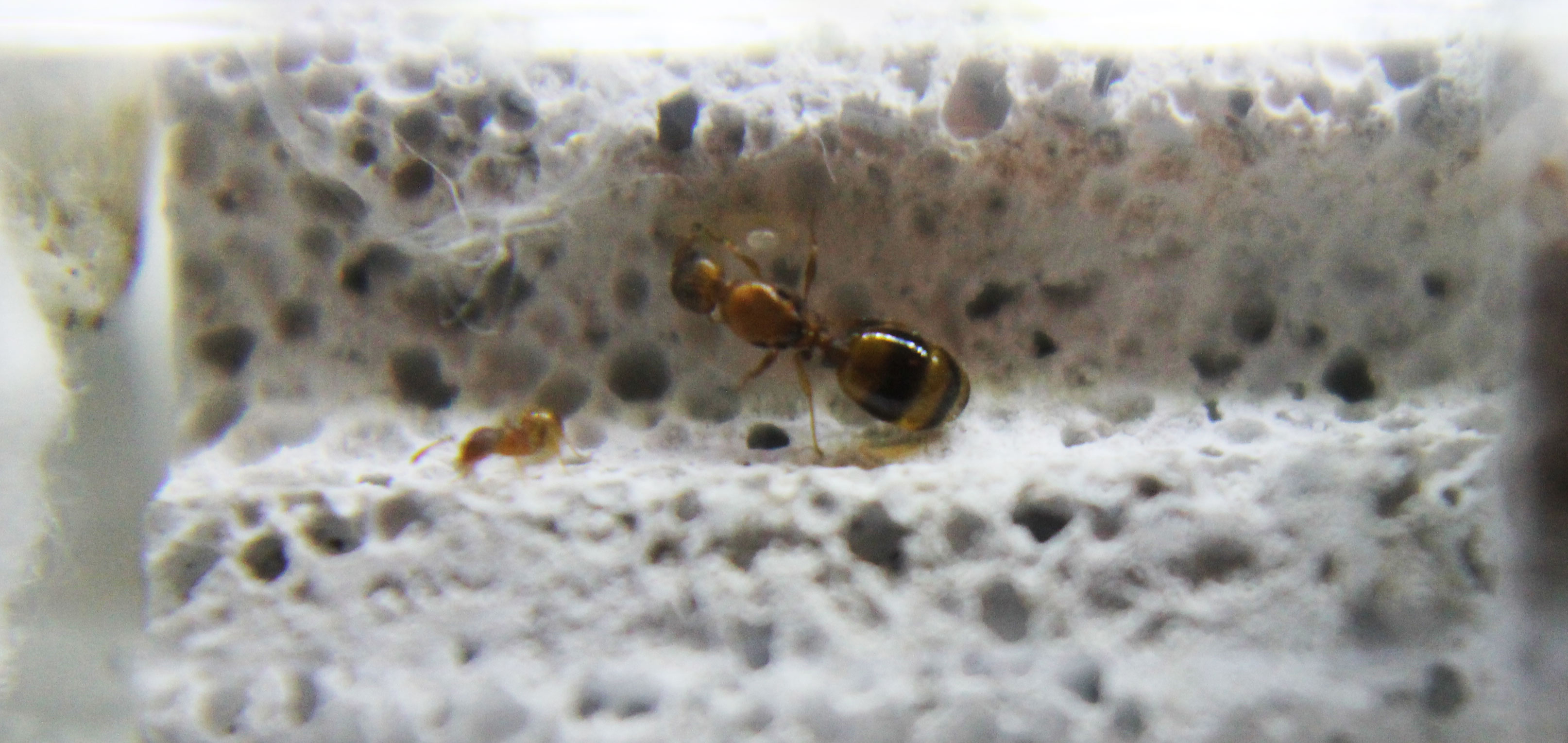 Secondo la mia esperienza con le Themnotorax arboricole, la soluzione dei mini nidi in sughero è sempre stata la migliore. Adesso la colonia è proprio minuscola, quindi va bene la provetta. Io le ho sempre allevate partendo da una provetta chiusa senza nessun substrato, trasferendole poi in una arena in piccoli quadrati di sughero con una o due stanze al massimo, chiusi da un coperchio di plexiglas come tetto per la visuale. Il tutto sollevato tipo palafitta da dei piedini di legno o stuzzicadenti, con la provetta per l'acqua sotto.