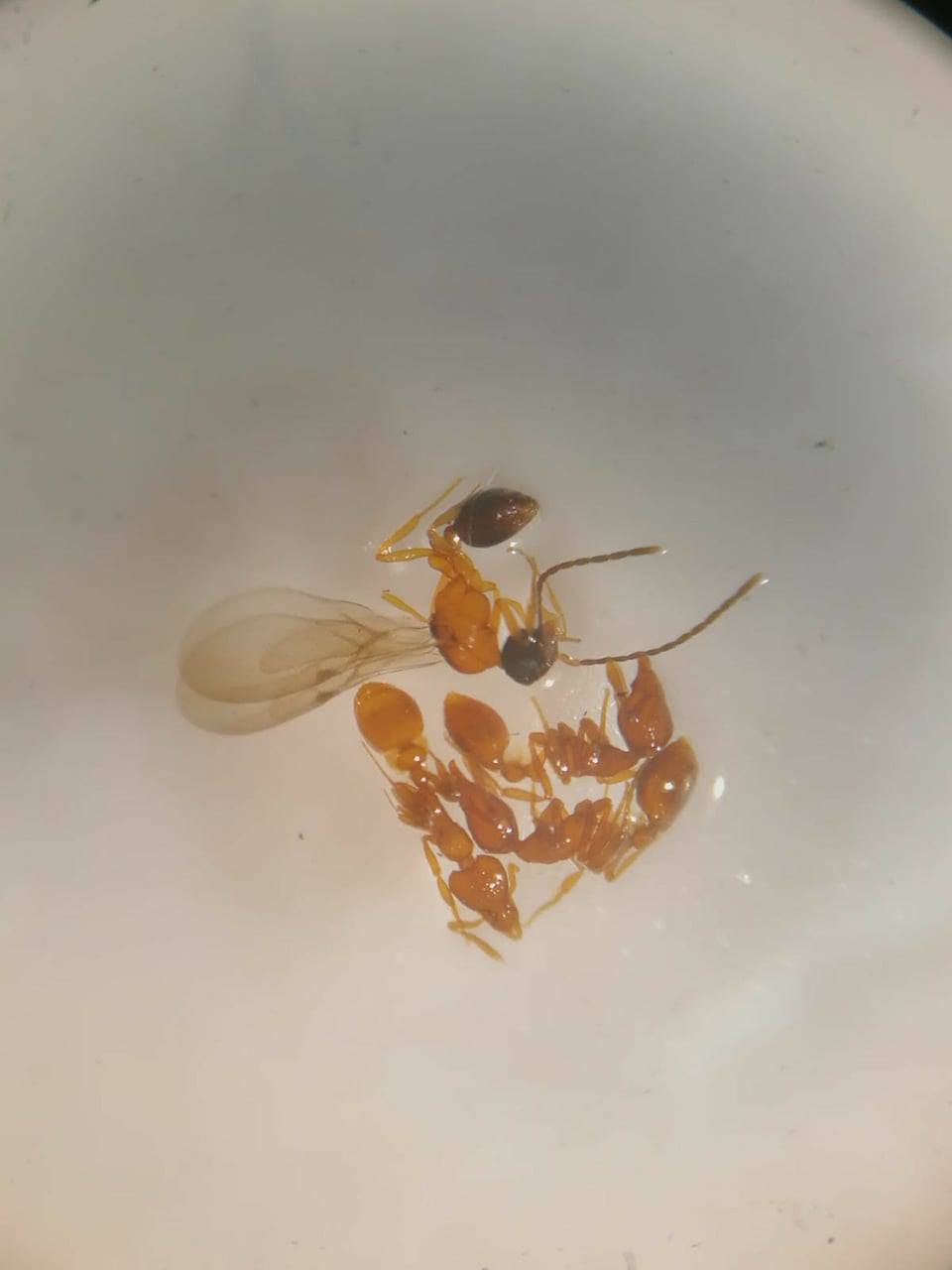La regina va d'accordo con le operaie, tuttavia inizialmente la vedo molto mobile: le operaie stavano sempre sul cotone umido, mentre la regina sempre all'ingresso con funzione apparentemente difensiva. Questo cambierà solo dopo la prima volta in cui darò collemboli e uova di Steatoda. Le operaie cacciano singolarmente, per poi nutrire la regina o tramite trofallassi oppure dandole proprio parti di collembolo.