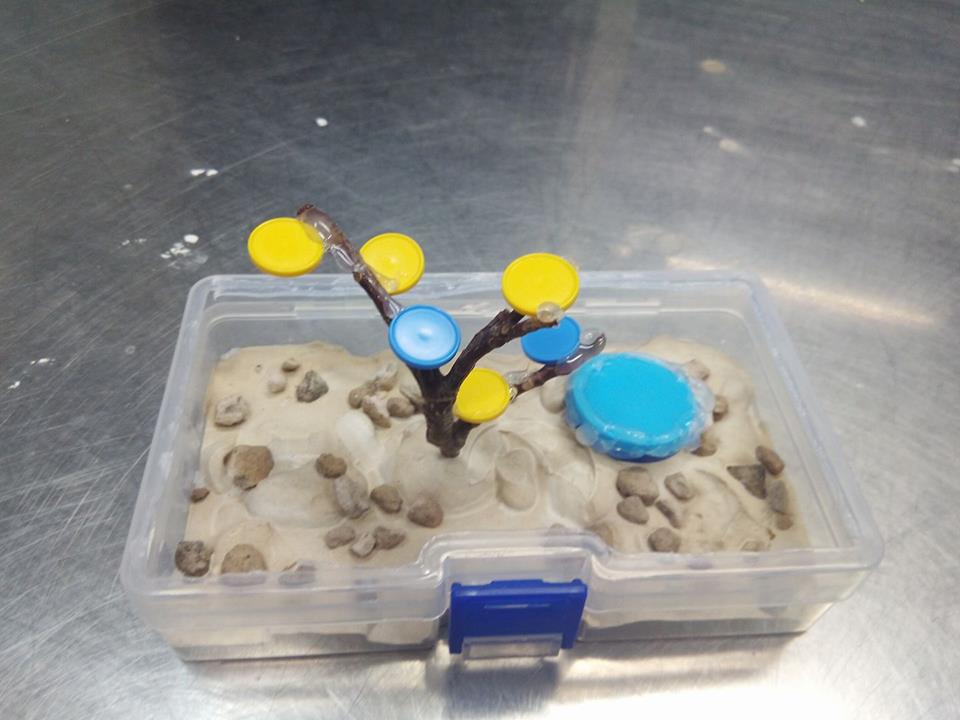 Prima prova di arena, con un fondo di scagliola, colorata con della terra rossa, sassolini di pomice incastonati ed un rametto... in teoria vorrei fare ancora due fori sul lato, uno per collegare il formicaio, futuro e l'altro per collegarci la provetta dove vive la mini-colonia di Lasius emarginatus. Quando poi le formiche si fossero trasferite ne formicaio "grande", ci collegherei una provetta per l'acqua.