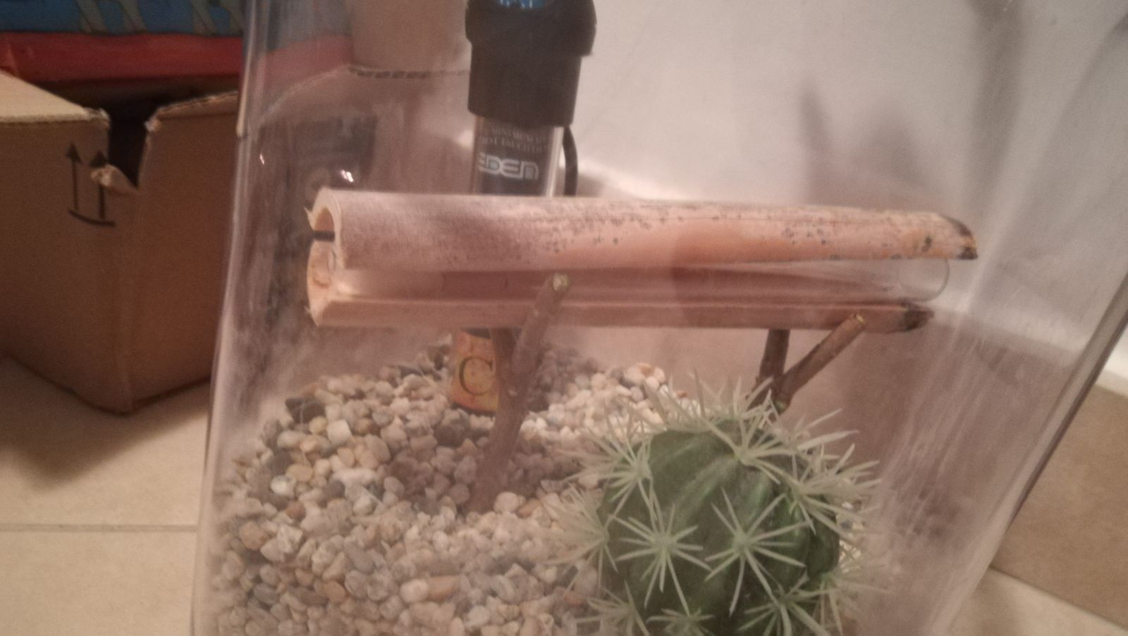 Ho inserito due rametti che poi sostengono la provetta in modo da non tenerla a diretto contatto con la ghiaia tiepida.