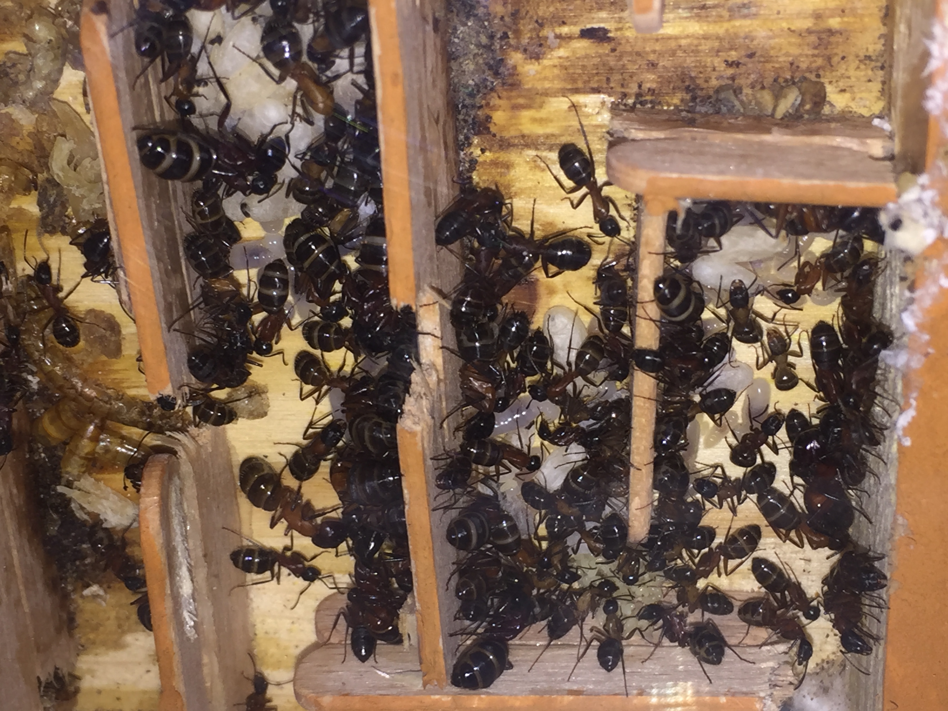 Ieri ho trasferito la colonia nel nuovo nido in legno a listelli 18x30 cm con arena laterale. Regina e operaie sembrano stare bene, ci sono dei soldati enormi e qualche larva. Forse durante l’inverno ne è stata rimangiata qualcuna, ma non ne sono certo.