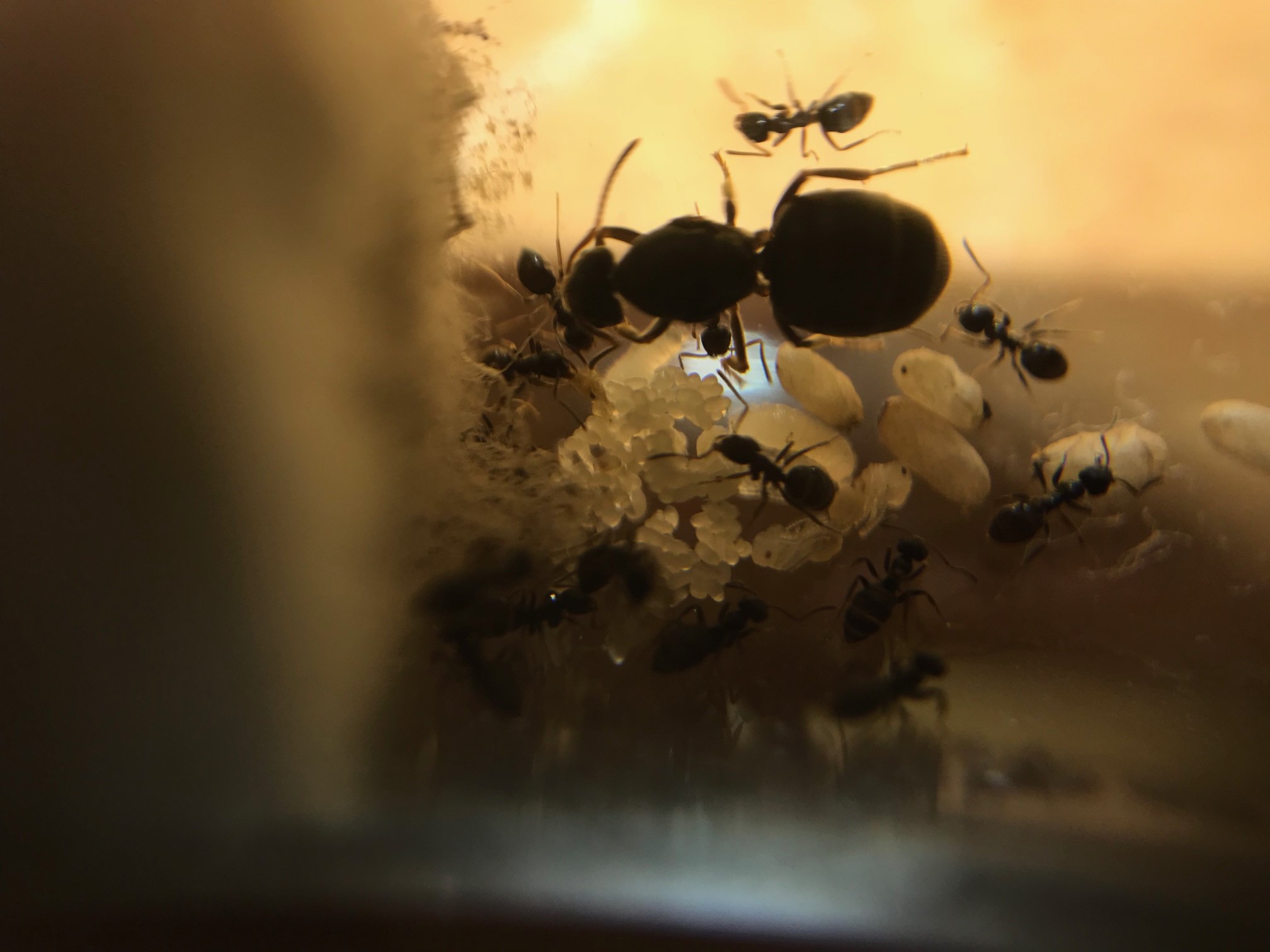 La mia colonietta di Lasius niger che entra adesso nel secondo anno ha iniziato bene la stagione, le larvette sono diventate bozzoli e c'è una bella covata nuova di pacca. Sono pochine per essere al secondo anno perchè il primo da bravo neofita che sono le ho fatte stare sui 22-24 gradi tutta la stagione e si sono sviluppate poco.