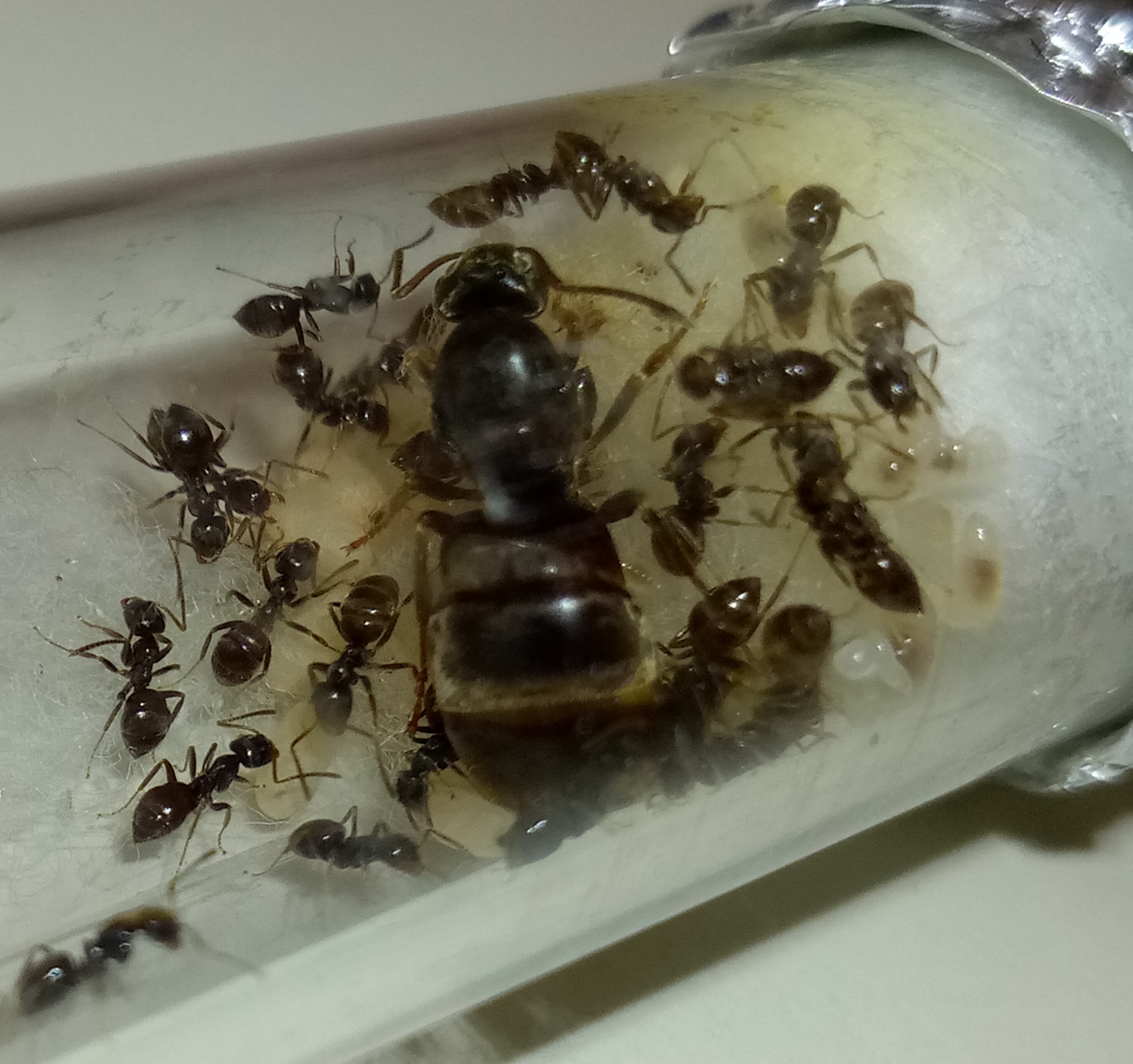 Questa regina comunque quando te l avevo trovata era attaccata dalle Lasius emarginatus e mi sembra che qualche piccola ammaccatura ce l avesse già, inoltre mi pare che quando avevi effettuato un trasferimento ti avessi già fatto presente che il gastro aveva qualcosa di strano (parlo di una cosa successa quest' estate comunque).