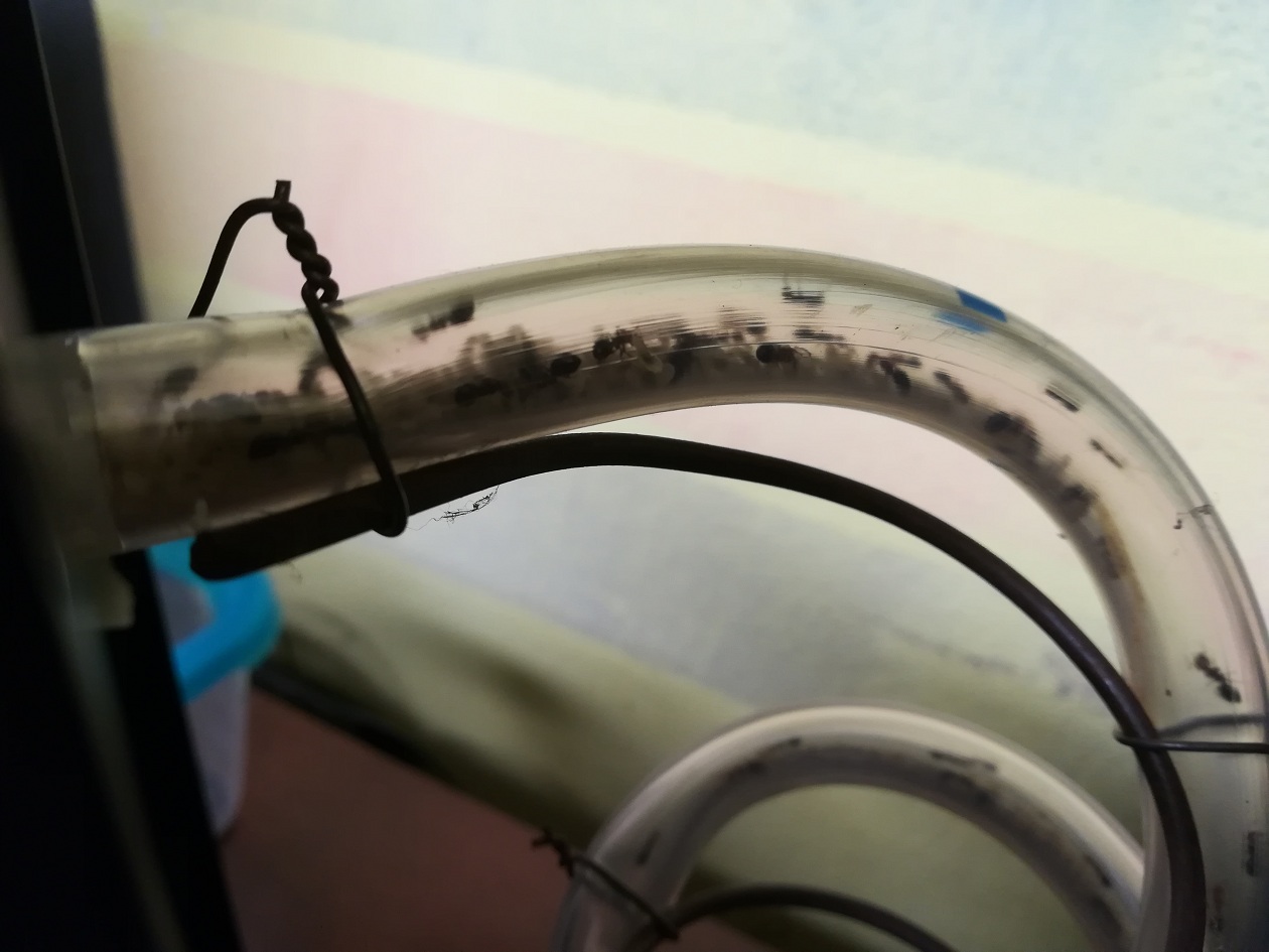 Con molta molta pazienza ho cercato di recuperarle tutte e le ho portate a casa provando a sistemarle nel formicaio che avevo realizzato tempo fa per i miei vecchi progetti. Si sono subito sistemate nel tubo che dal contenitore dove le ho trasportate porta al formicaio e li sono rimaste sistemandosi con uova, larve e pupe. Hanno anche cominciato a scavare una galleria nella poca terra che avevo messo nella parte alta del formicaio.